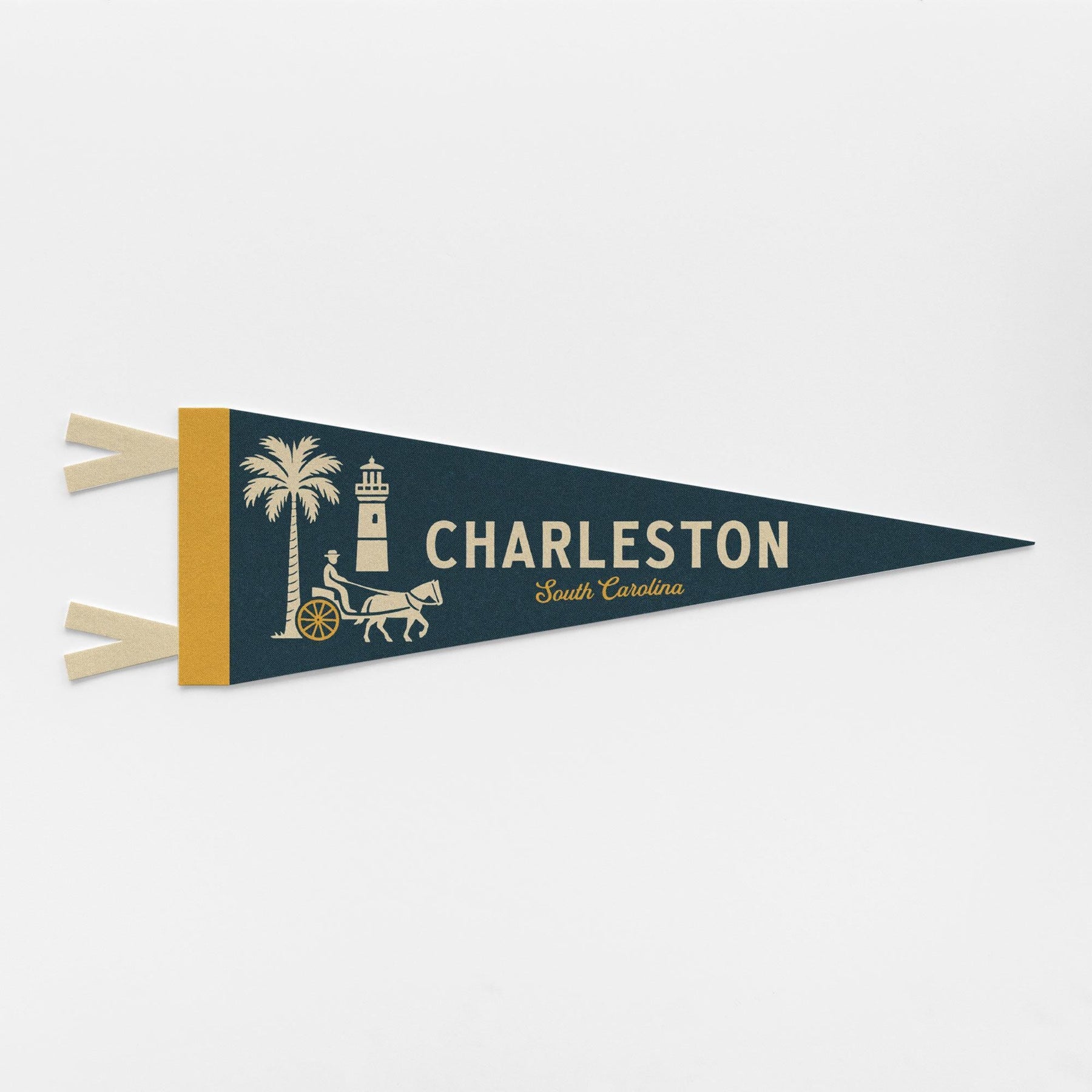 Bring home a little Lowcountry charm with this Charleston pennant — a tribute to the city’s palm-lined streets, historic charm, and coastal beauty. Illustrated with a horse-drawn carriage, the iconic lighthouse, and the palmetto tree, it captures the timeless rhythm of a slow Southern afternoon by the sea.