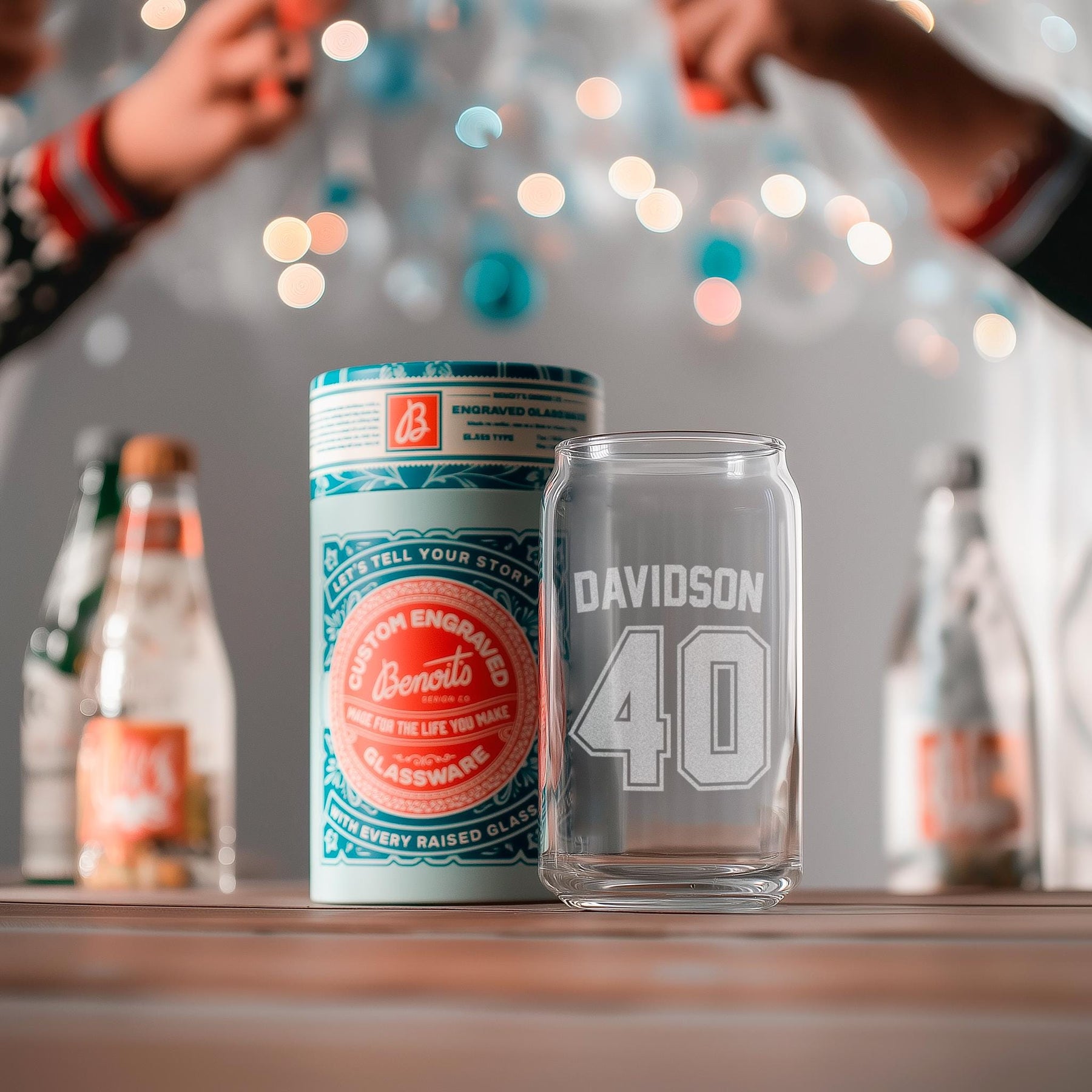 This customizable sports jersey glass is a classic tribute to the fans who never miss a game. Designed with bold, vintage-inspired jersey lettering, each glass can be personalized with a name and number—making it a meaningful keepsake that feels both timeless and personal. Whether it’s Grandpa’s lucky pint, a coach’s end-of-season gift, or a nod to your favorite player's birth year, this glass turns a simple drink into a story. Sturdy, comfortable in hand, and easy to use every day, it’s equally at home on the bar, in the garage, or front and center on game day.