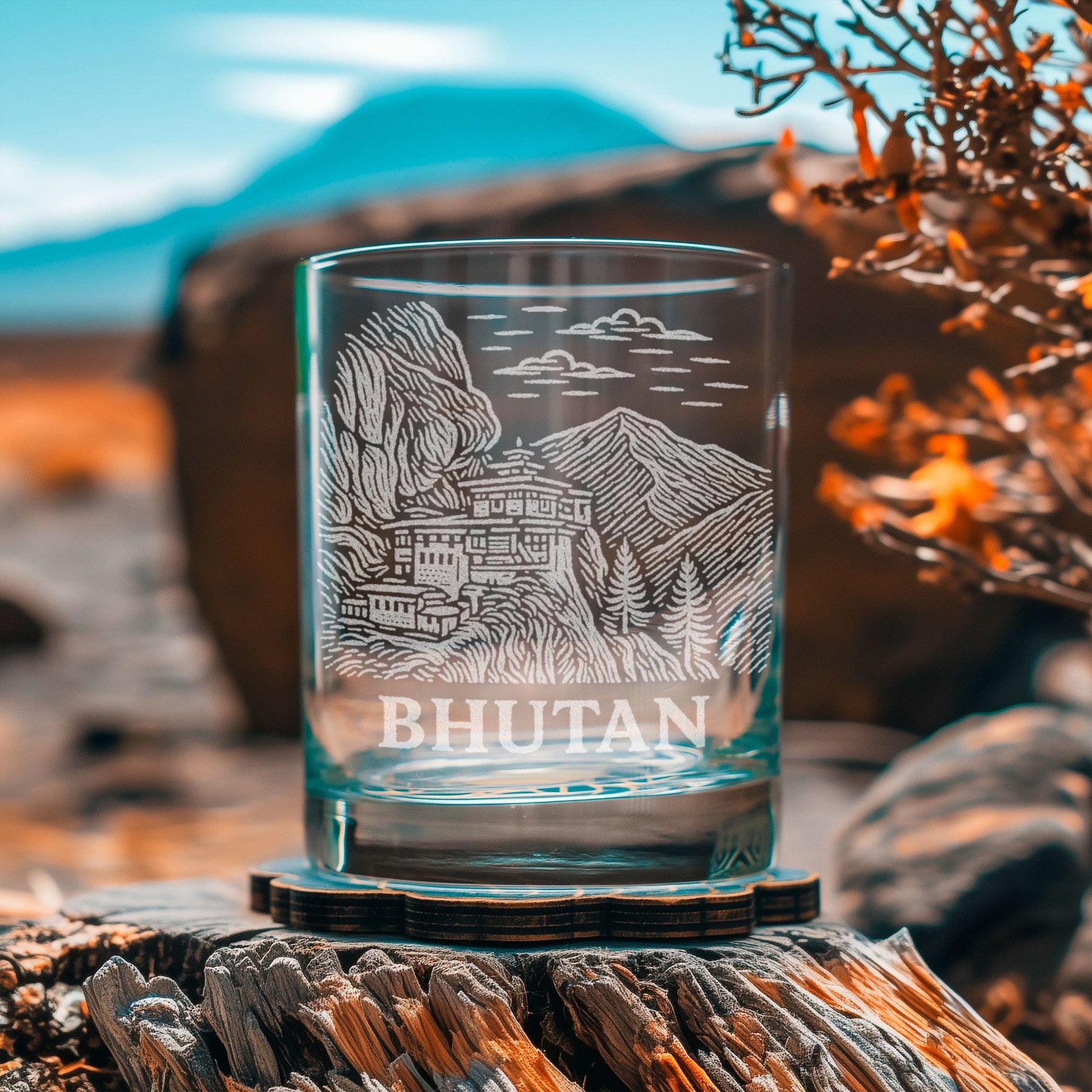 Celebrate the peaceful spirit and breathtaking landscapes of Bhutan with this beautifully engraved glass. Featuring traditional Bhutanese architecture, rolling mountain ridgelines, and lush hillside scenery, this design reflects the serene beauty of the Himalayan kingdom. Etched in a vintage-inspired style, the artwork evokes quiet monasteries, prayer-flag breezes, and misty mountain paths that make Bhutan feel timeless and deeply spiritual.