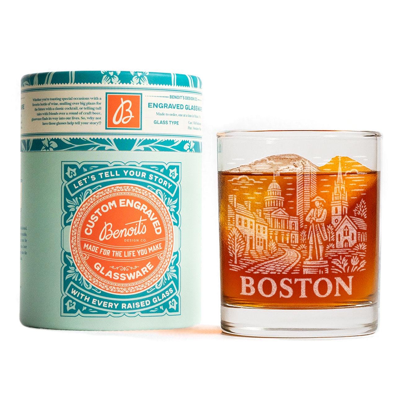 Celebrate the rich history and timeless charm of Boston with this beautifully engraved glass. Featuring classic city architecture, tree-lined walkways, and the iconic blend of old-world brick and modern skyline, this design captures the spirit of one of America’s most beloved cities. Etched in a vintage-inspired style, the artwork reflects the character of Boston’s cobblestone streets, historic landmarks, and scenic waterfront views.