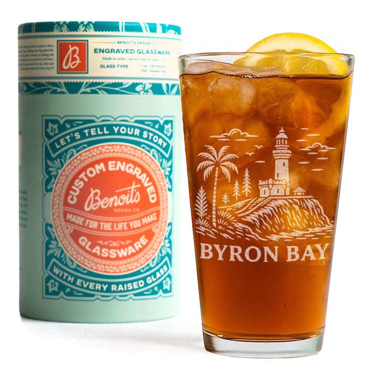 Bring the relaxed coastal magic of Byron Bay to your next pour with this beautifully engraved glass. Featuring gentle ocean waves, rolling headlands, a peaceful shoreline path, and the iconic laid-back spirit the region is known for, this design captures the essence of Australia’s most beloved surf town. Etched in a vintage-inspired style, the artwork reflects sunlit beaches, breezy mornings, and the easy rhythm of life along the northern New South Wales coast.