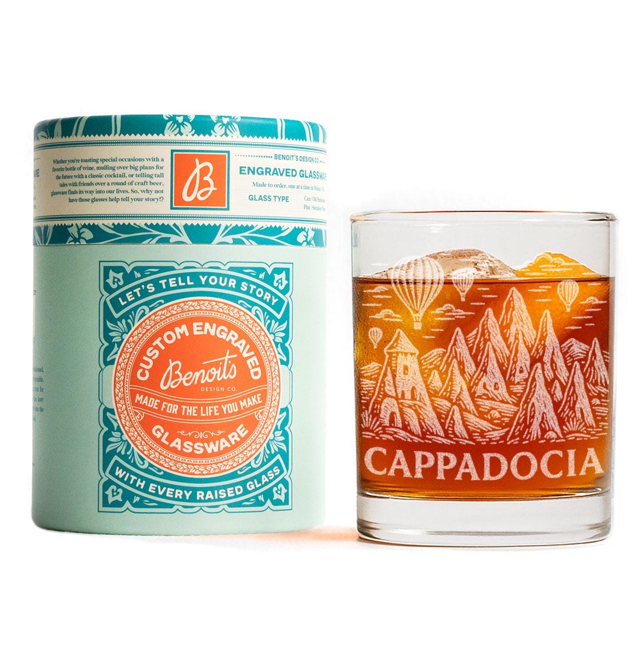 Capture the dreamlike beauty of Cappadocia with this beautifully engraved glass. Featuring its iconic fairy chimneys, soft rolling valleys, ancient rock-carved landscapes, and the peaceful rise of hot air balloons drifting across the horizon, this design reflects the magical atmosphere of one of Turkey’s most unforgettable regions. Etched in a vintage-inspired style, the artwork evokes sunrise glows, quiet canyon paths, and the surreal rock formations that make Cappadocia feel like another world.