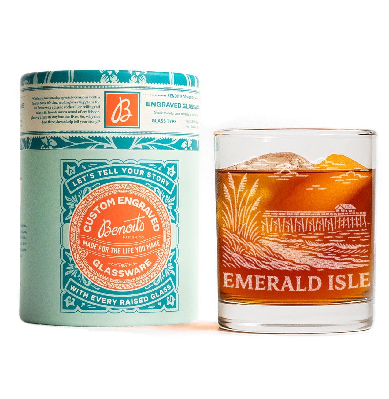 Bring the calm, sunlit beauty of Emerald Isle to your next pour with this beautifully engraved glass. Featuring soft dune lines, gently rolling Atlantic waves, and the peaceful horizon of North Carolina’s Crystal Coast, this design captures the laid-back charm that makes Emerald Isle a favorite beach escape. Etched in a vintage-inspired style, the artwork reflects shell-covered shores, breezy sea oats, and the relaxed rhythm of life along this treasured stretch of the Outer Banks.