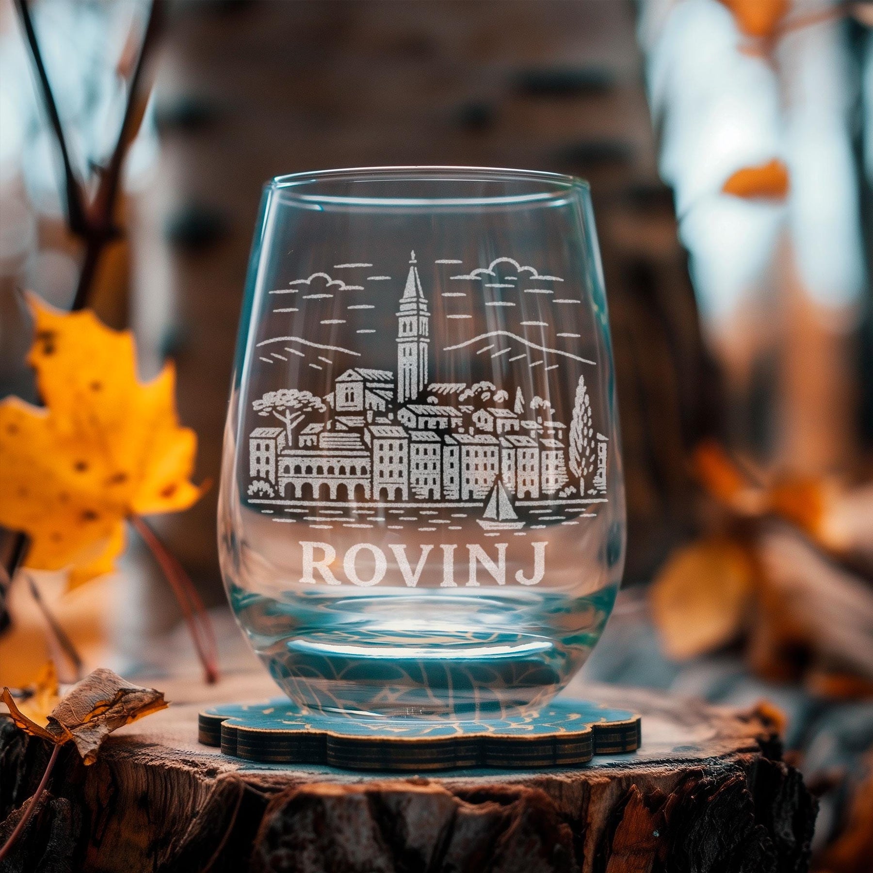 This etched design reflects that atmosphere with shoreline contours, hillside silhouettes, and soft architectural lines inspired by Rovinj’s iconic waterfront. It’s a tribute to sunlit harbors, Mediterranean breezes, and the timeless coastal beauty that makes Rovinj one of Croatia’s most beloved destinations.