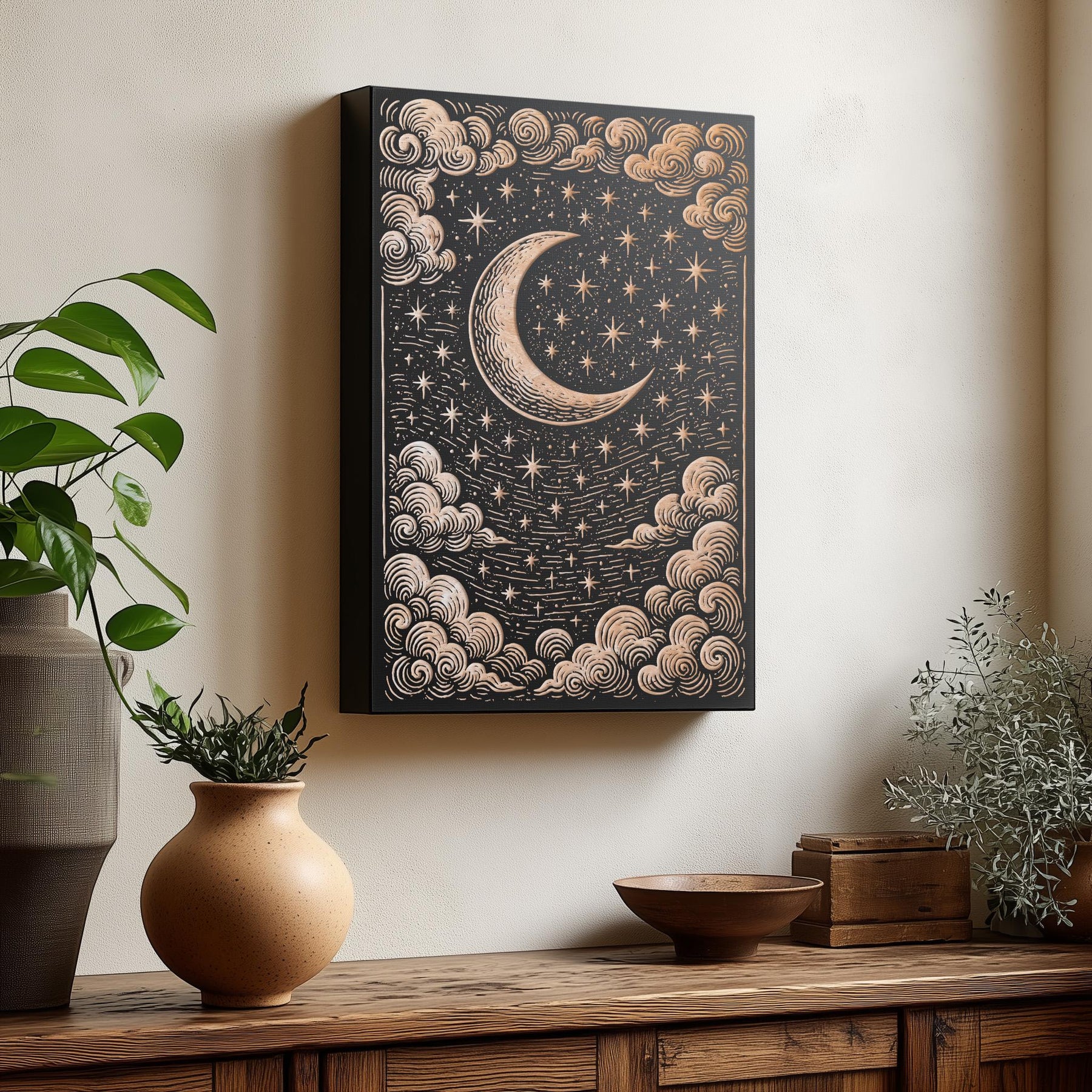 Celestial Moon & Stars Engraved Birch Illustration