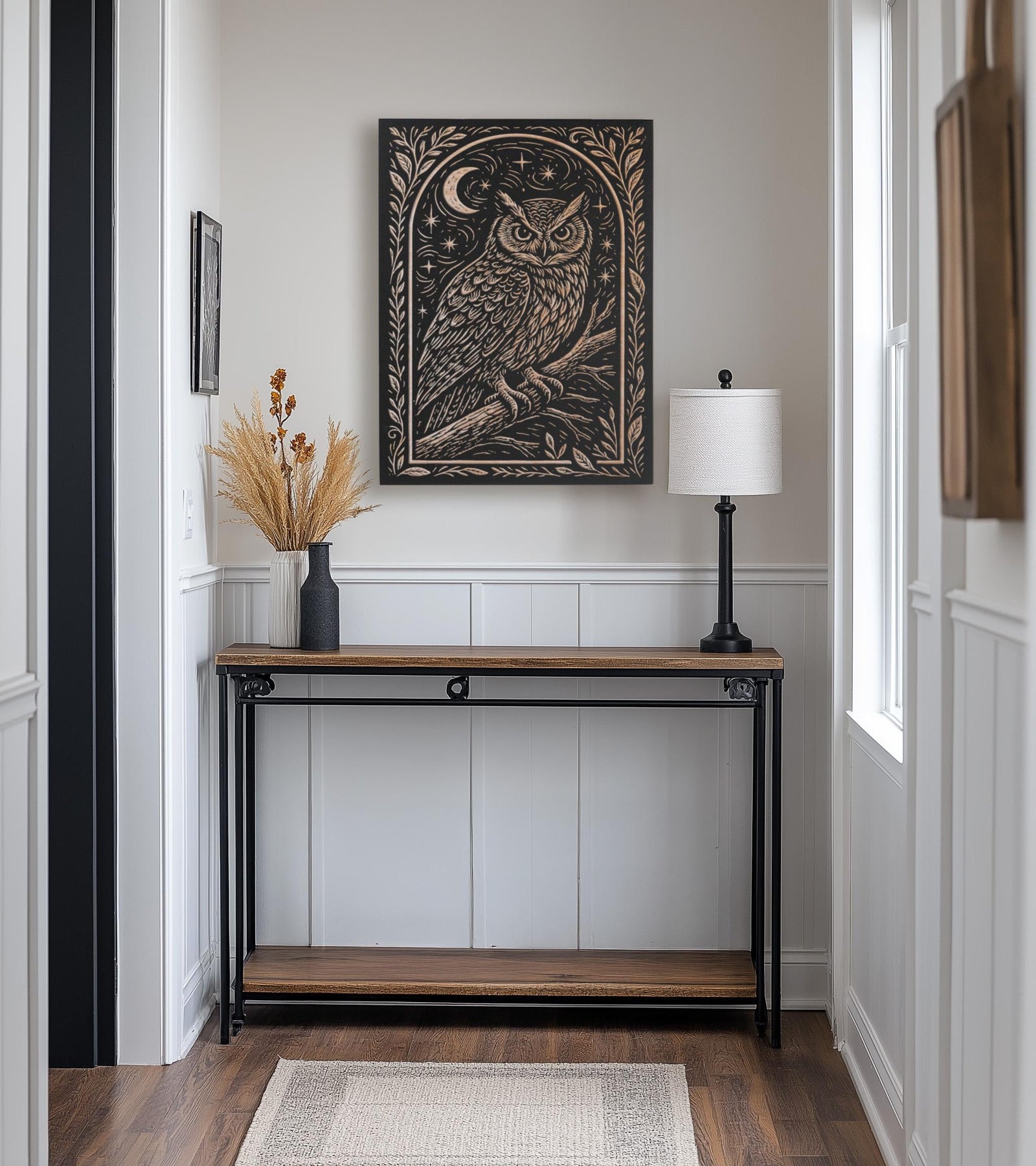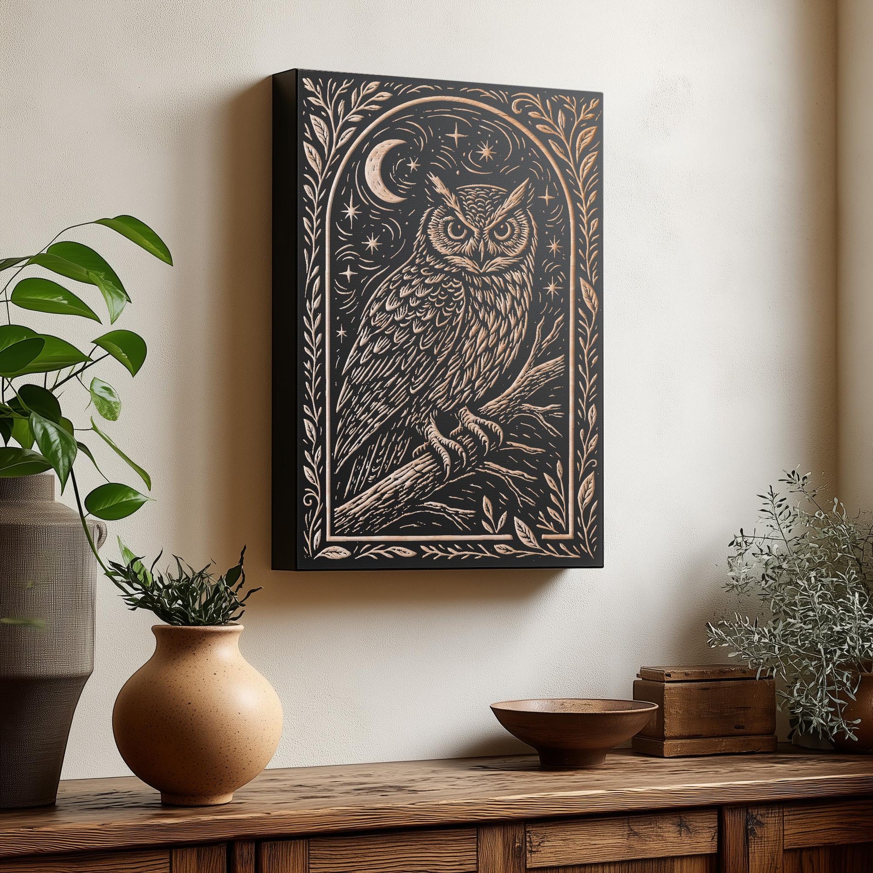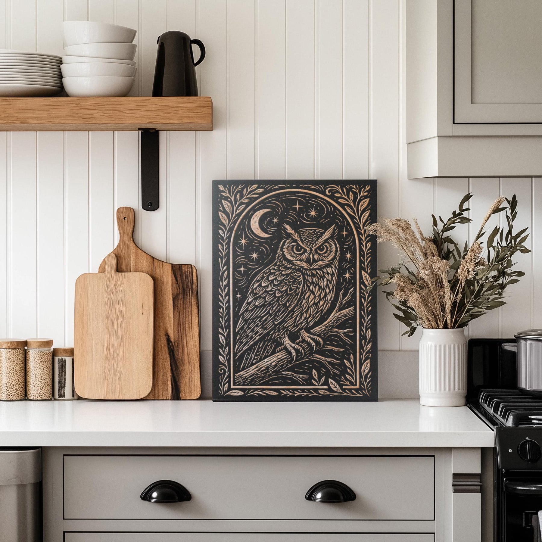 Add a touch of woodland magic to your space with this engraved birch wood wall art featuring a wise owl perched beneath the moon and stars in a linocut style. Made in America with thoughtful attention to detail, this piece blends rustic craftsmanship with mystical charm. Perfect for wildlife lovers, stargazers, or cozy cabins.