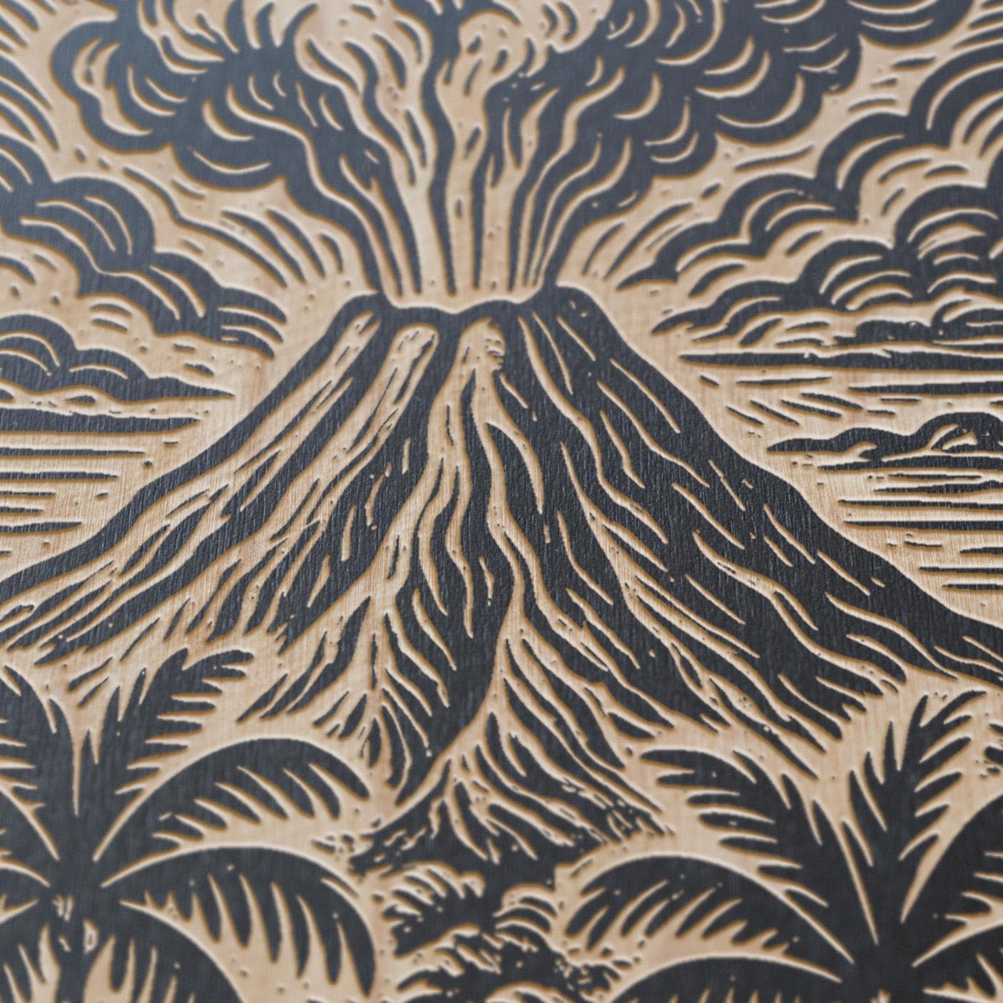 Bring the power and beauty of nature into your home with this engraved birch wood wall art featuring a volcano rising above palm trees and tropical blooms in a linocut style. Each piece is proudly made in America with close attention to detail, blending rustic craftsmanship with bold design. A striking accent for adventurous spirits, tropical homes, or nature-inspired spaces.