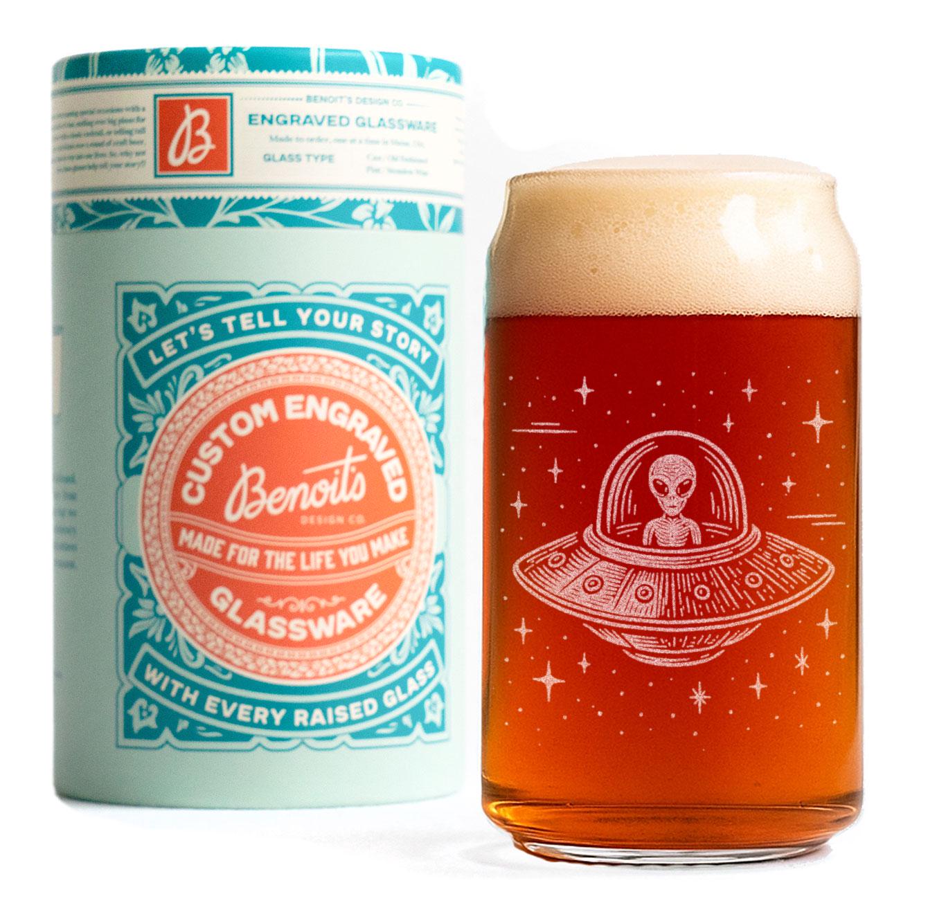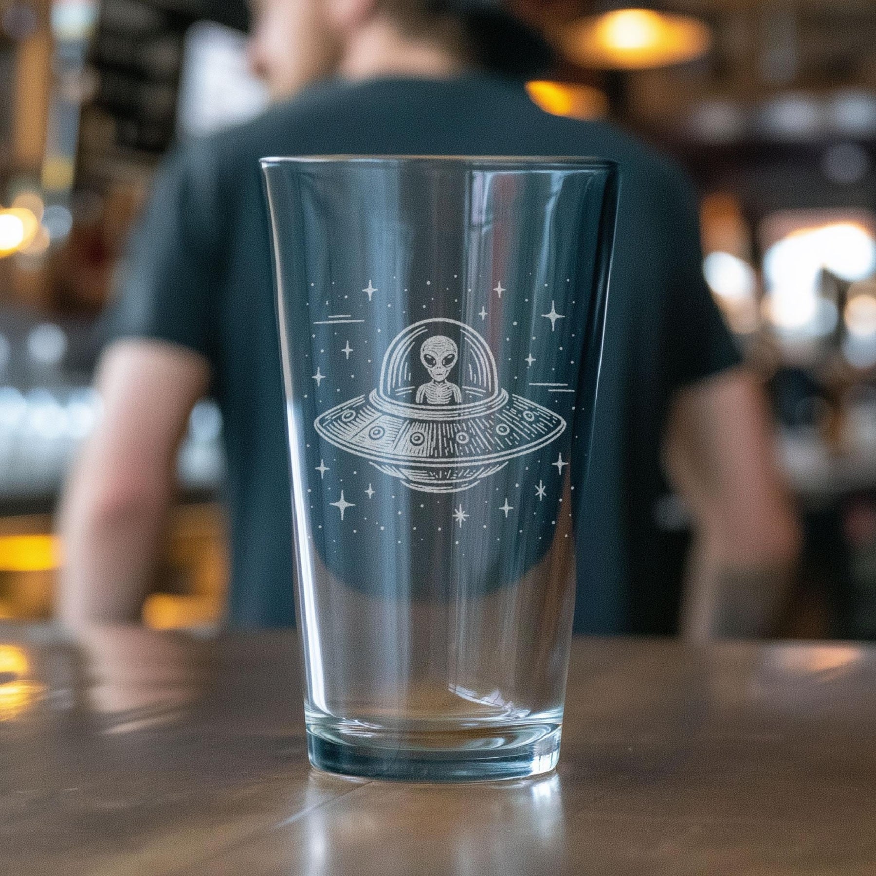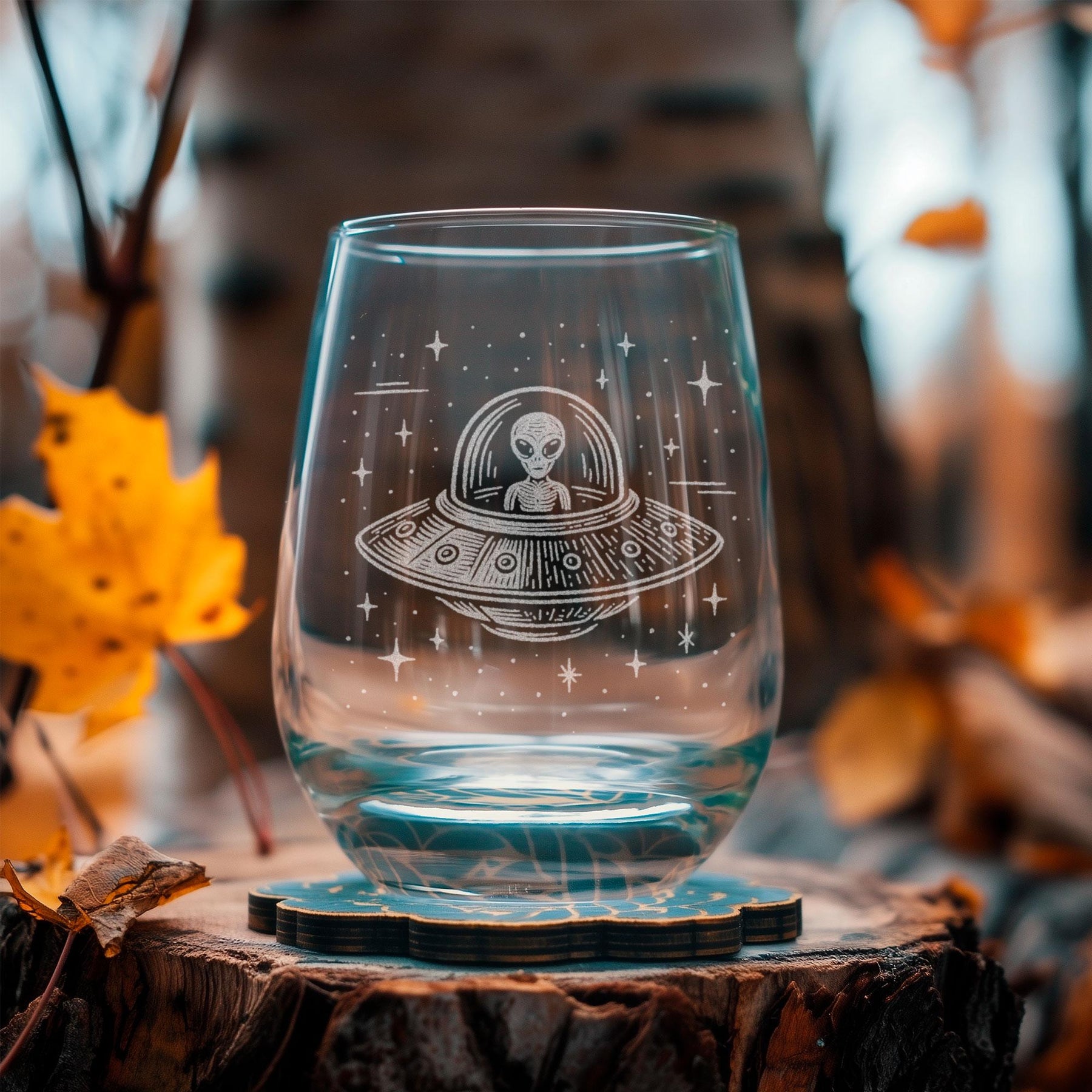 Out of this world and into your hand — our Flying Saucer Glasses feature a detailed engraving of a curious alien piloting its UFO through a field of stars. Perfect for space dreamers, sci-fi fans, and anyone who loves a bit of mystery with their drink.