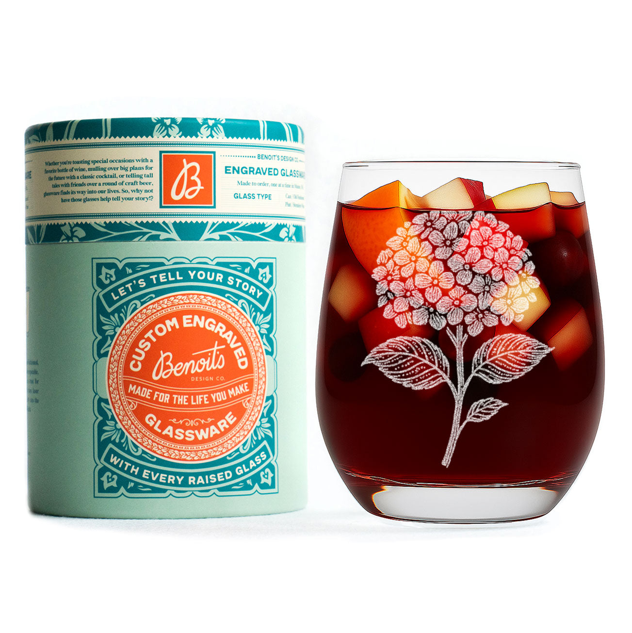 Bring the charm of a summer garden to your table with our Hydrangea Glasses. Featuring a beautifully detailed laser-etched hydrangea bloom, this design captures the soft, full petals and timeless elegance of this beloved flower.