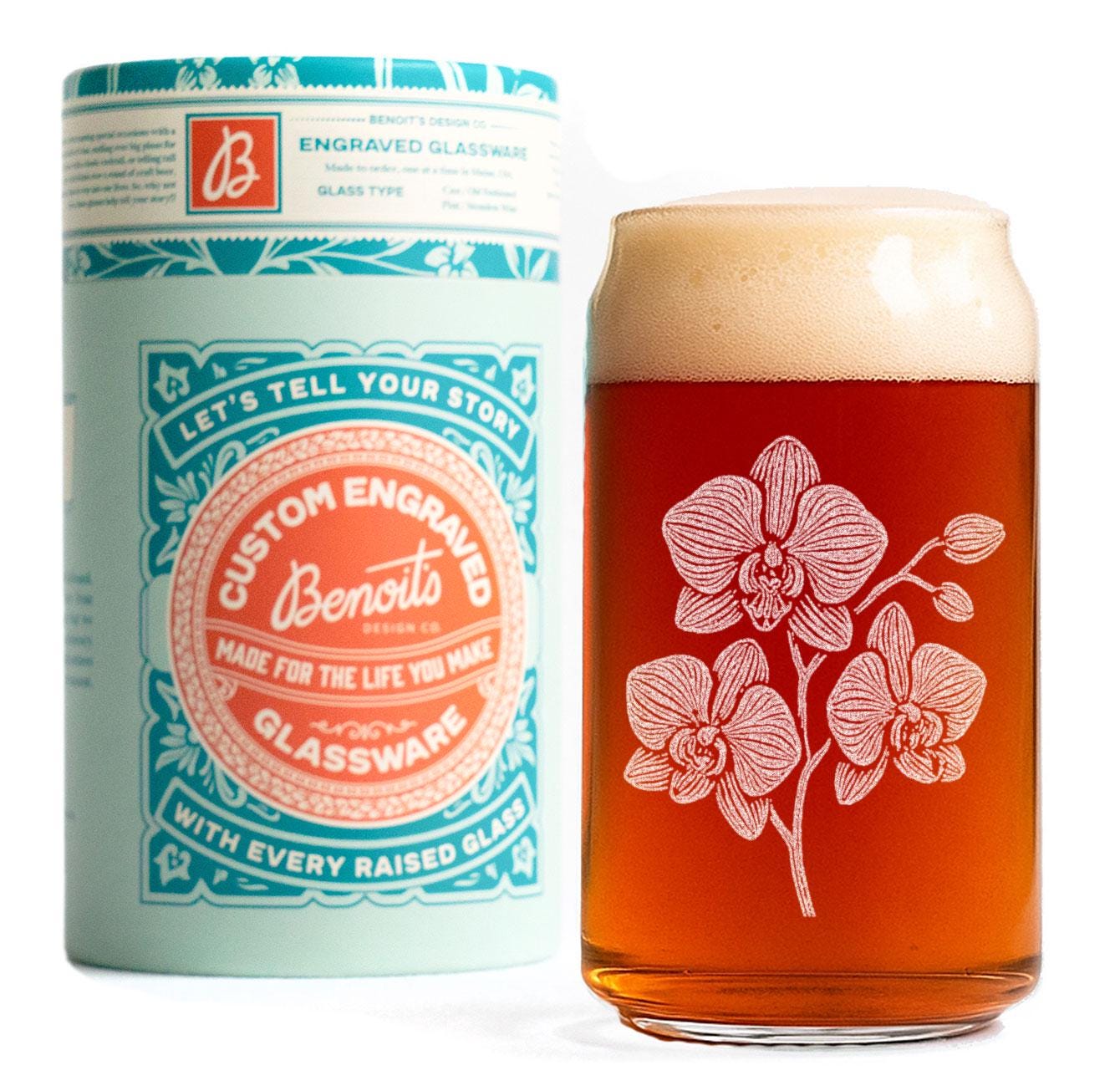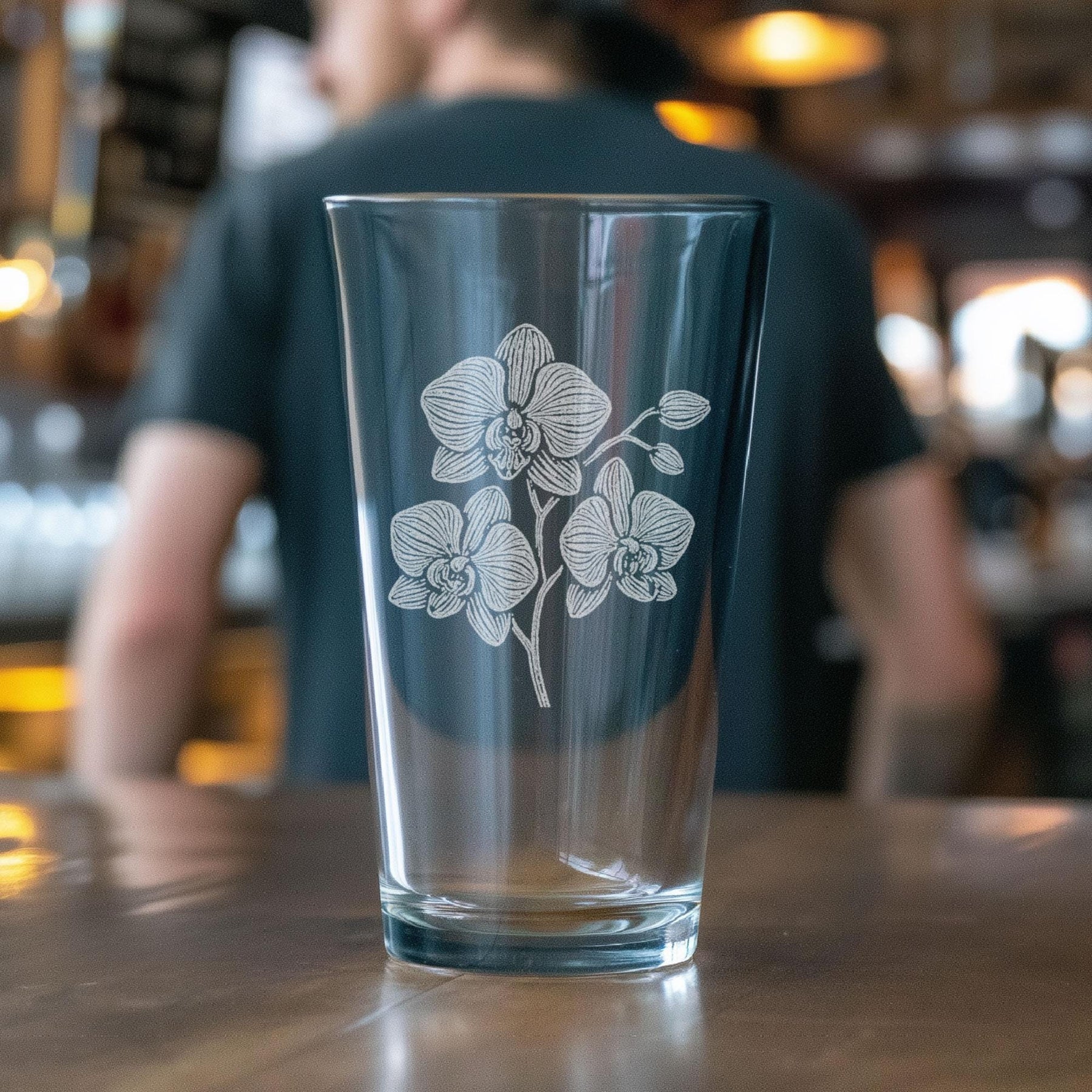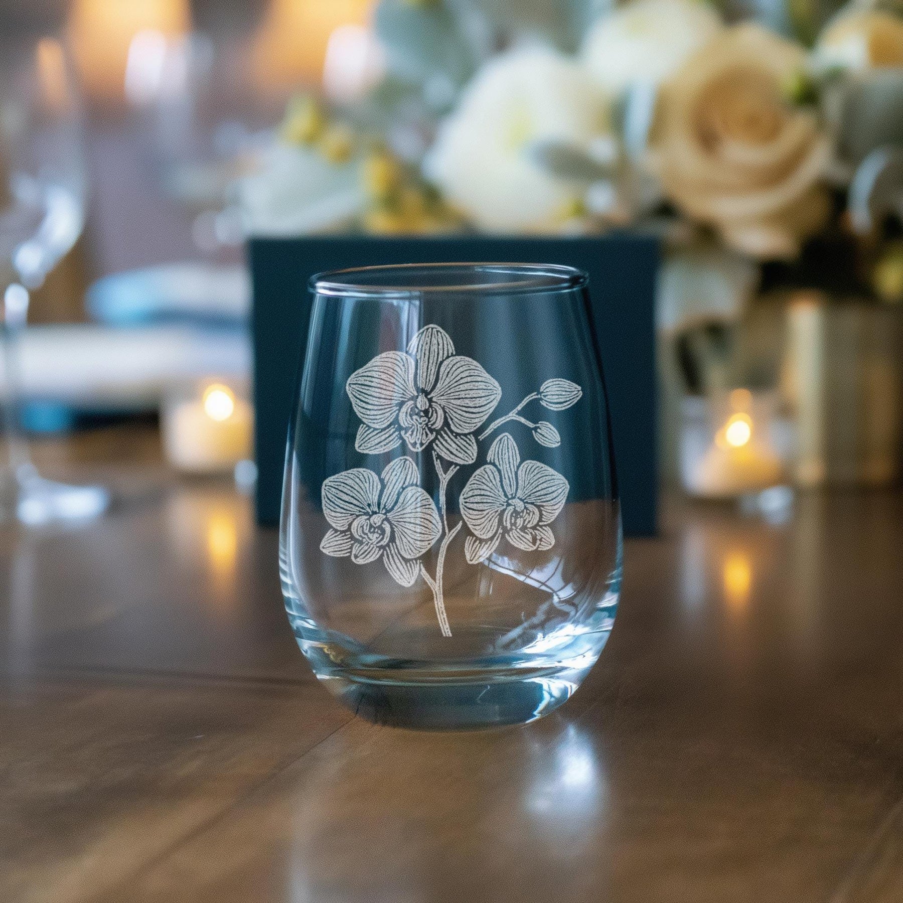 Bring a touch of delicate beauty to every glass with our Orchid Glass. Featuring a finely detailed laser-etched illustration of blooming orchid flowers, this graceful botanical design adds a soft, elegant flourish to your drinkware.