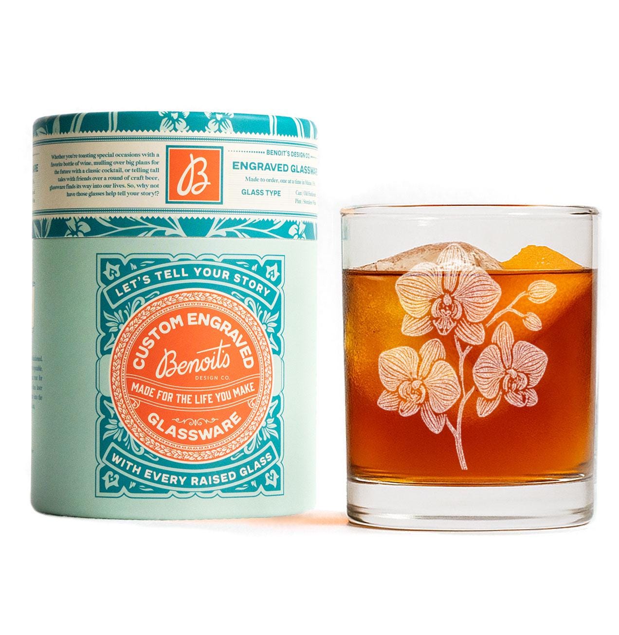 Each glass is etched in our Maine studio for crisp artwork that won’t fade or wash away. Whether you're enjoying whiskey, cocktails, iced tea, or a cozy evening pour, the gentle charm of these orchid blossoms makes every sip feel a little more special.
