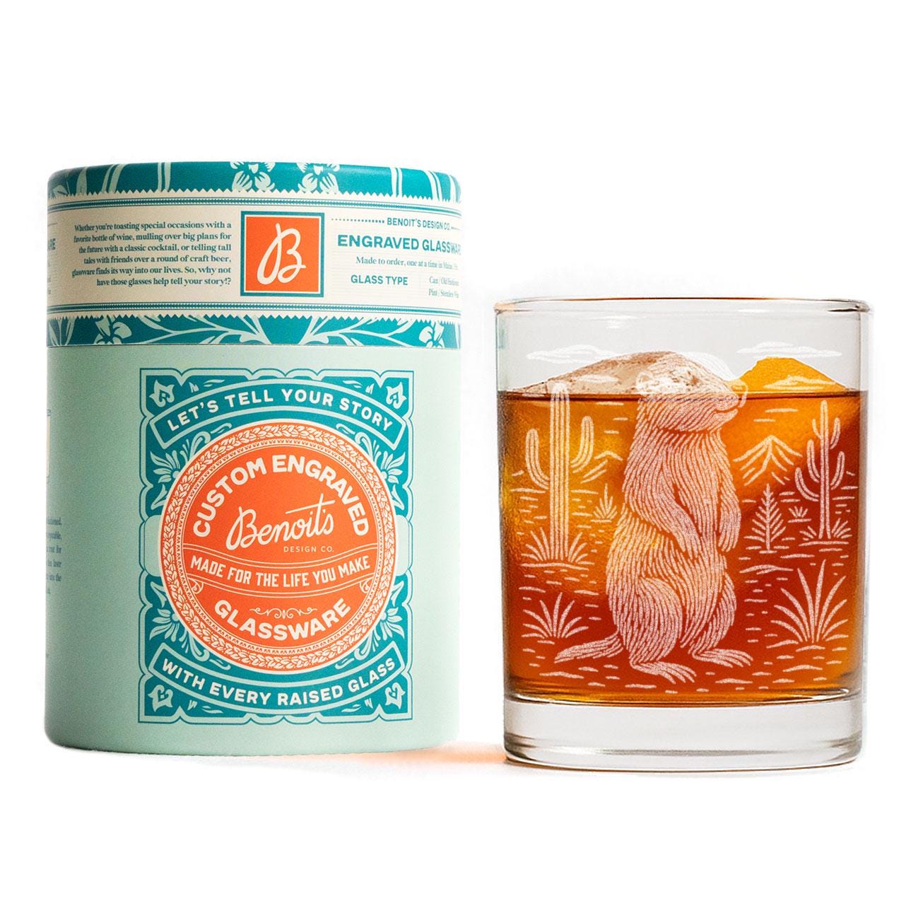 Meet the little sentinel of the Southwest. Our Prairie Dog Glass features a charming, finely engraved illustration of a prairie dog standing tall among desert grasses, cacti, and wide-open skies. The detailed linework captures its alert posture and the warm spirit of the landscape it calls home.