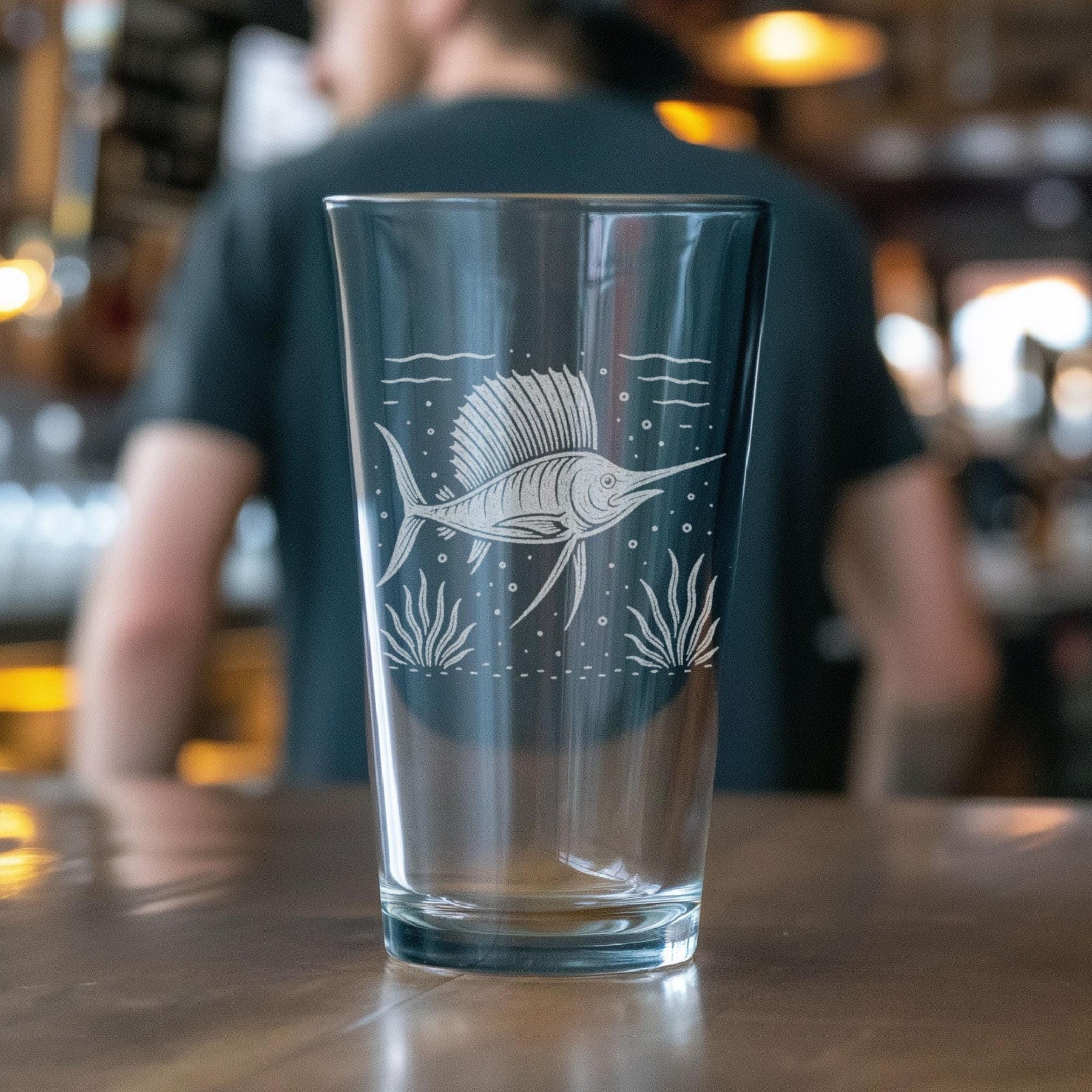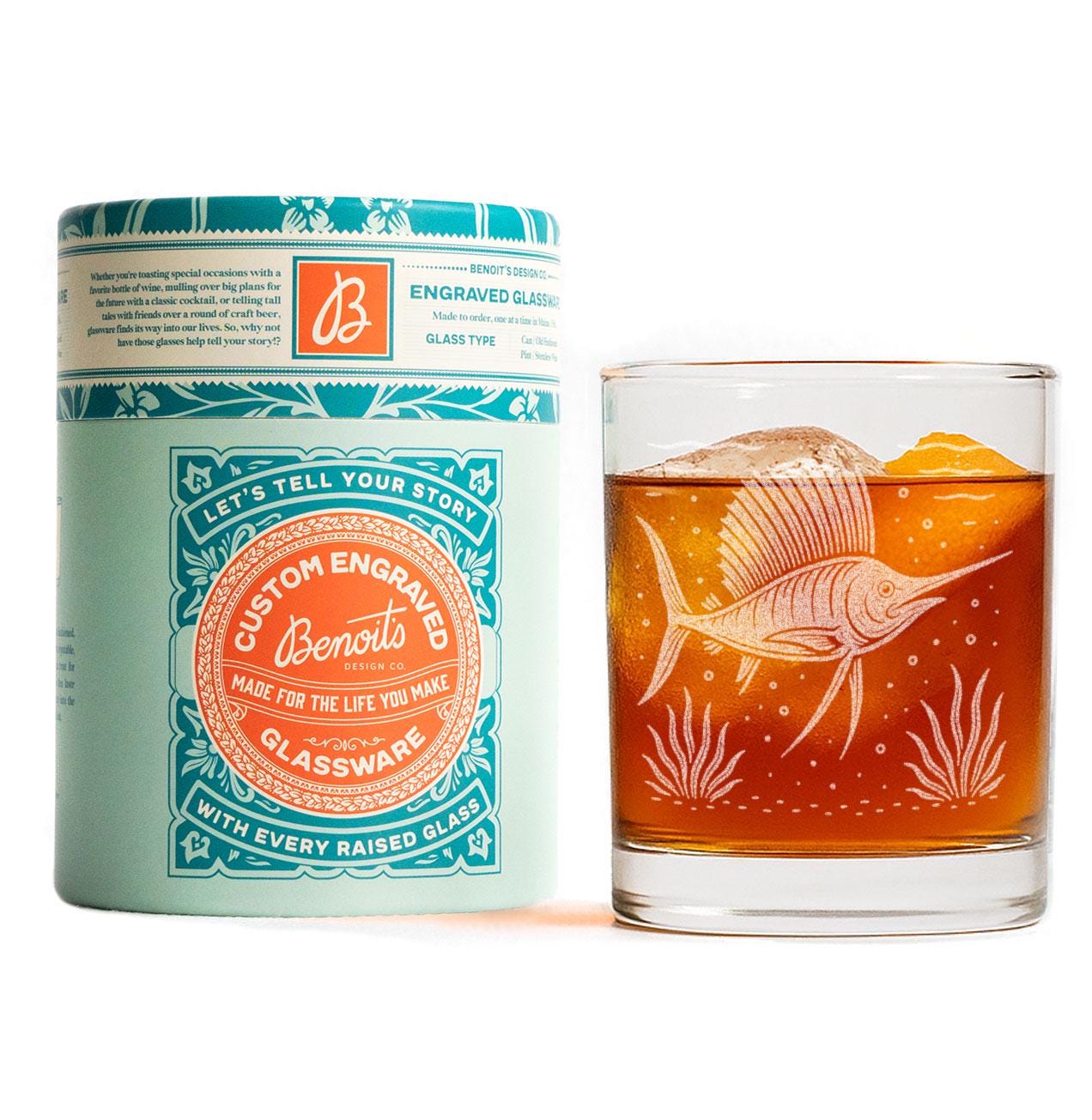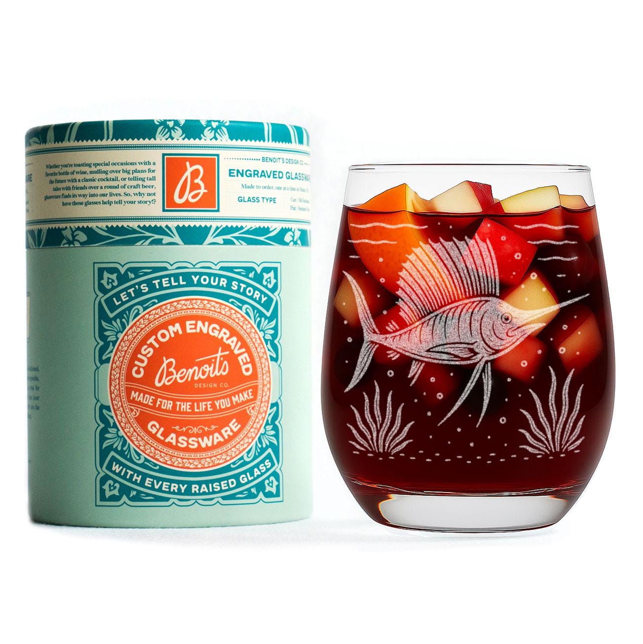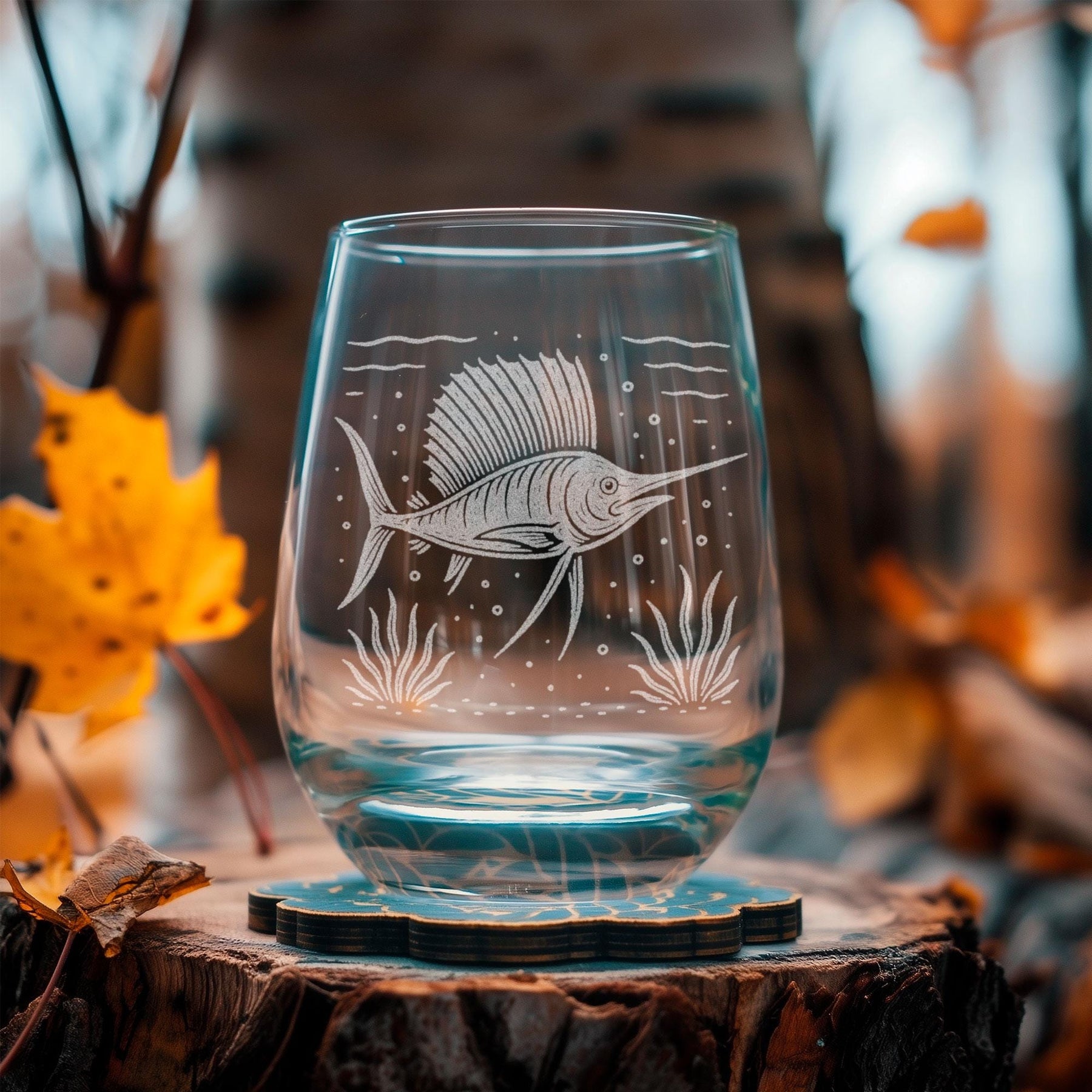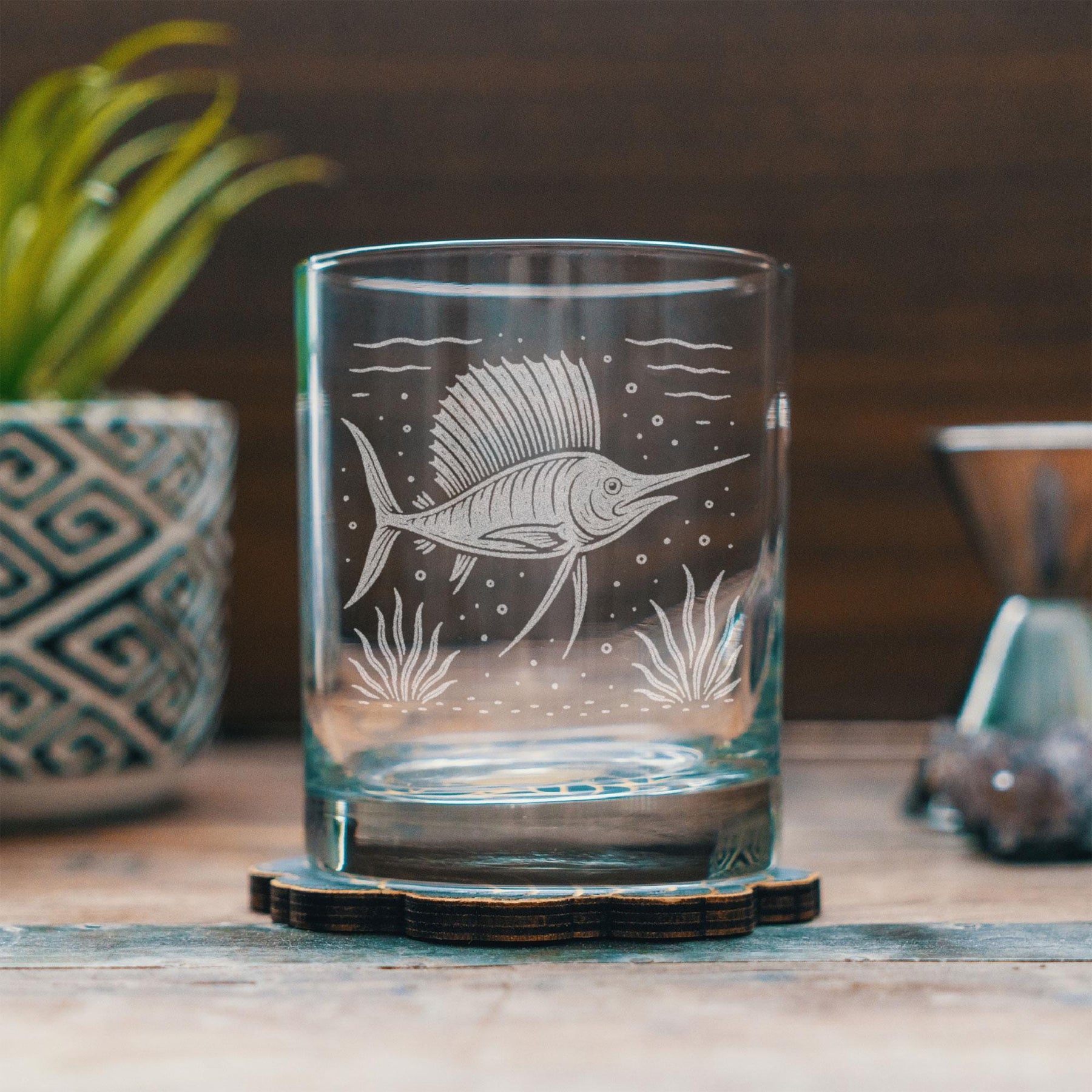 Bring a splash of ocean energy to every drink with our Sailfish Glass. This finely detailed laser-etched illustration features a striking sailfish gliding through underwater plants and gentle waves — perfect for anglers, beach lovers, and anyone who feels at home on the coast.