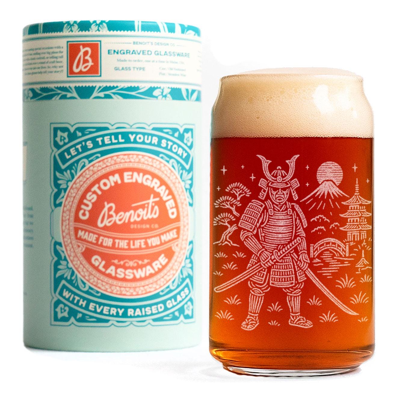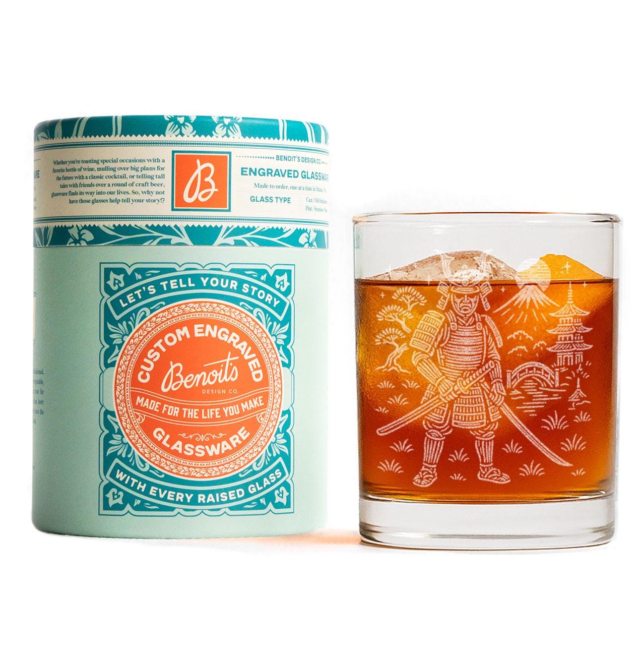 Each glass is laser-etched in our Maine studio, creating a crisp, permanent design that won’t fade or wash off. Whether you’re pouring iced tea, craft beer, or a well-earned evening cocktail, this samurai brings quiet strength to every sip.