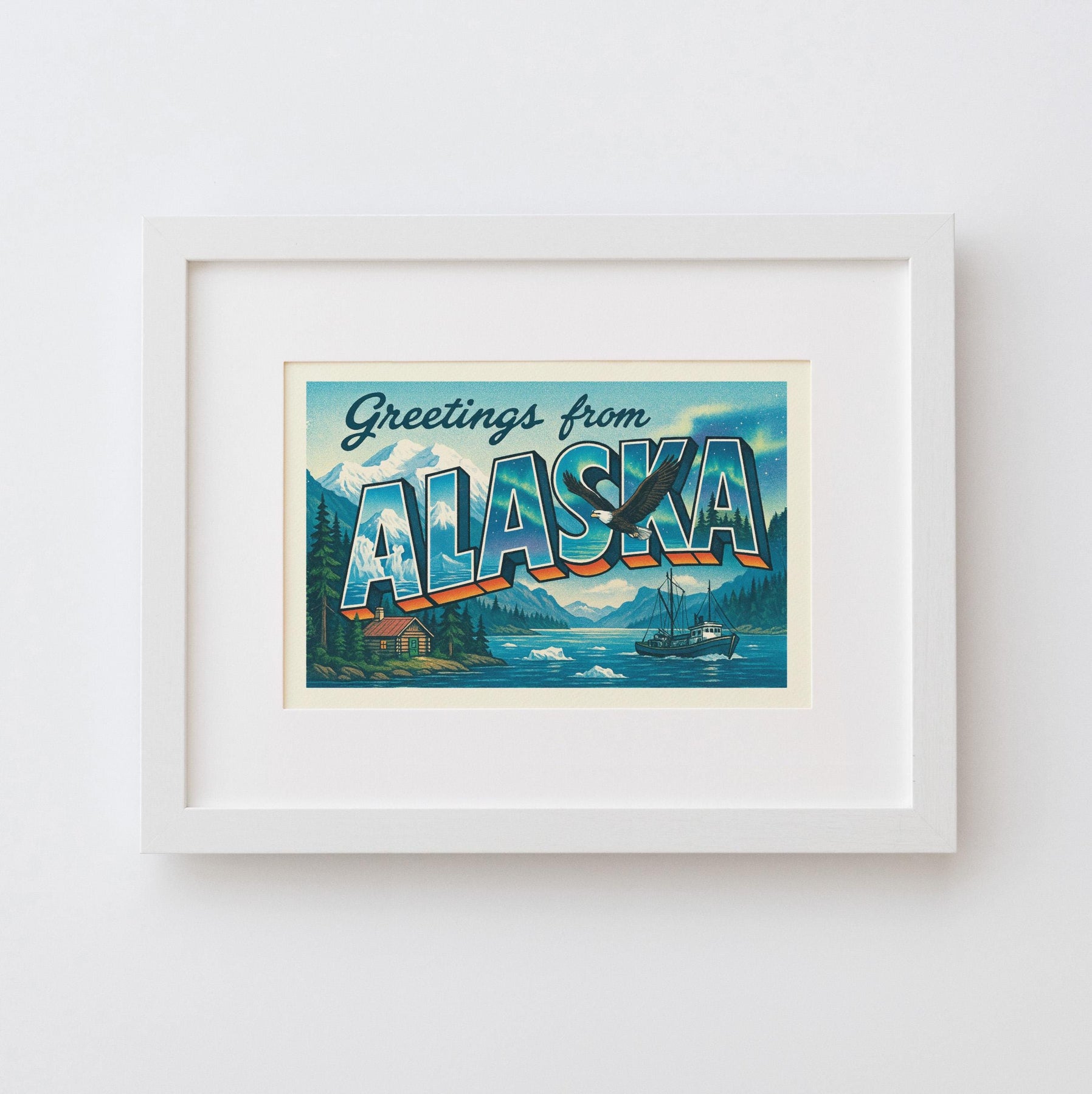 Bring a touch of classic Americana into your home with this “Greetings from Alaska” vintage postcard style print. Featuring bold retro lettering and iconic imagery from the Last Frontier—towering snow-capped mountains, northern lights, bald eagles, rustic cabins, and fishing traditions—this piece is perfect for travelers, collectors, and anyone who loves Alaska pride.