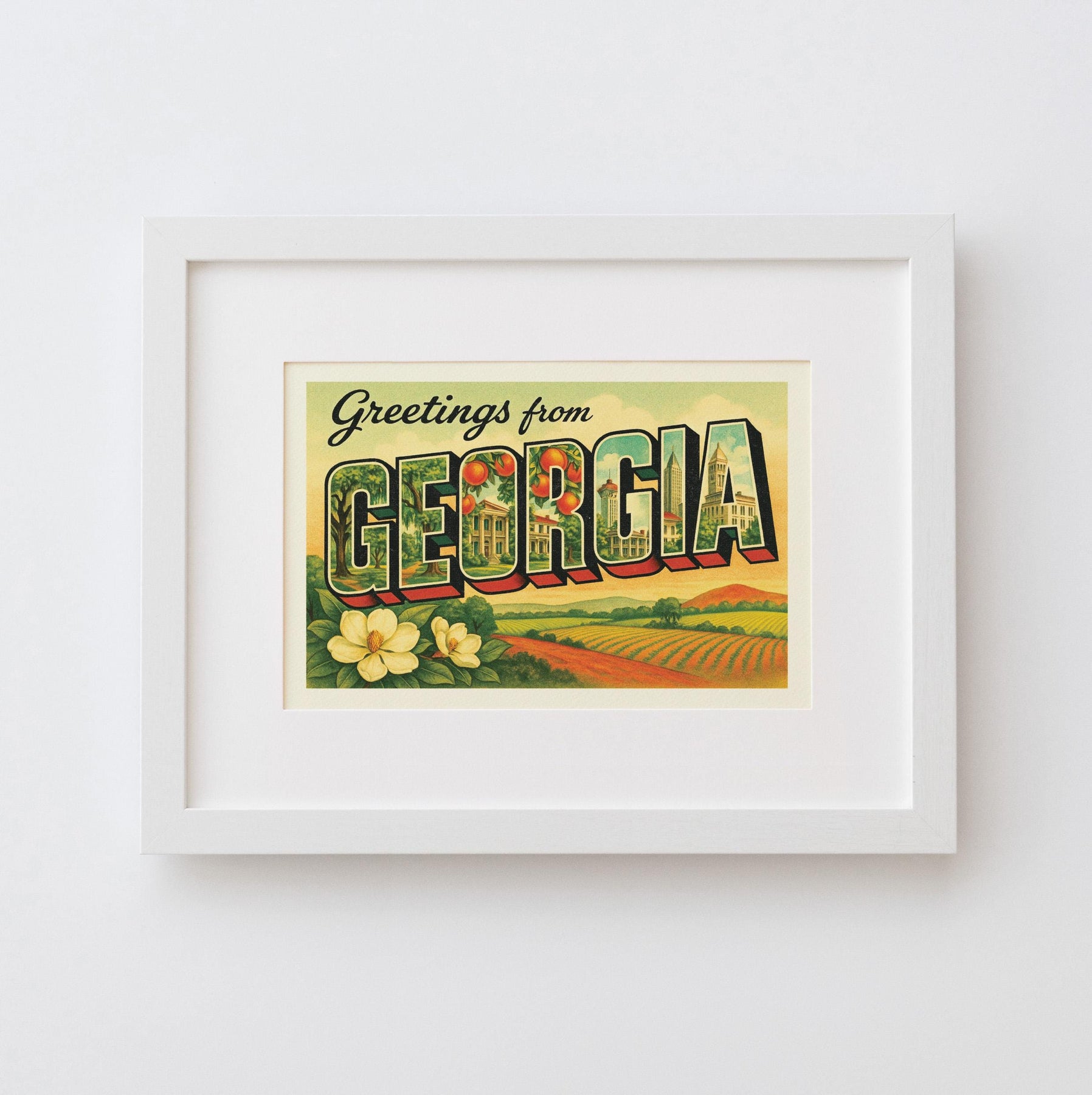 Bring a touch of classic Americana into your home with this “Greetings from Georgia” vintage postcard style print. Featuring bold retro lettering and iconic imagery from the Peach State—rolling farmland, historic architecture, magnolia blossoms, and Georgia’s signature peaches—this piece is perfect for travelers, collectors, and anyone who loves Georgia pride.
