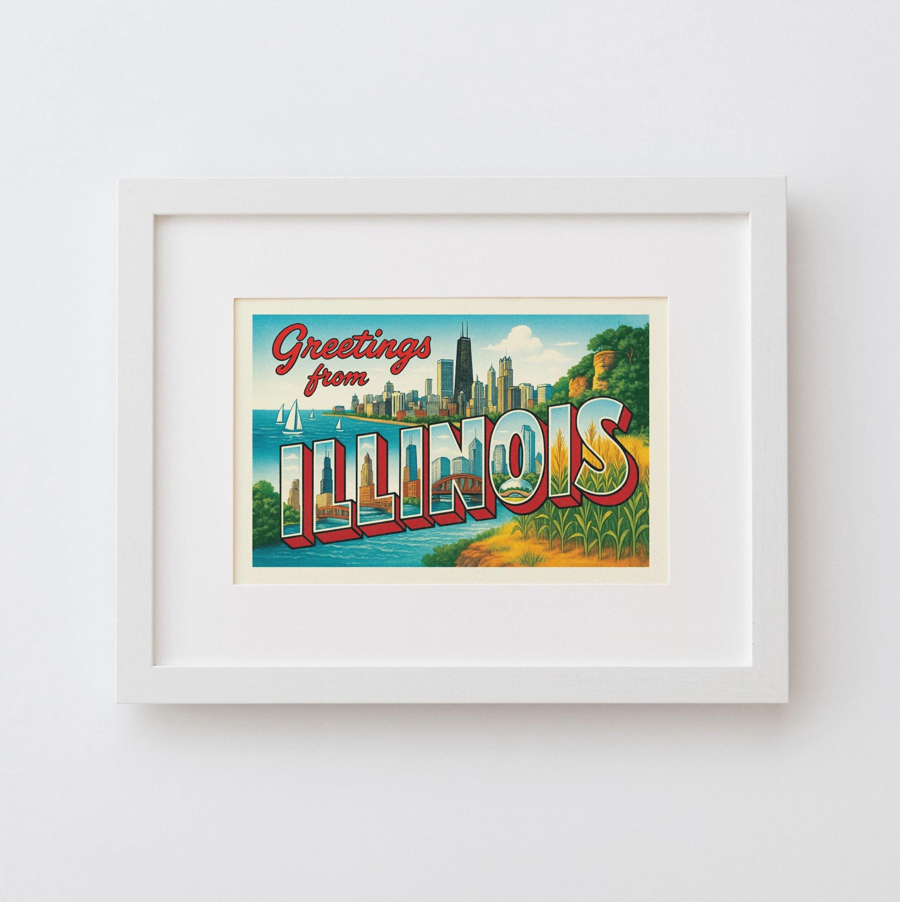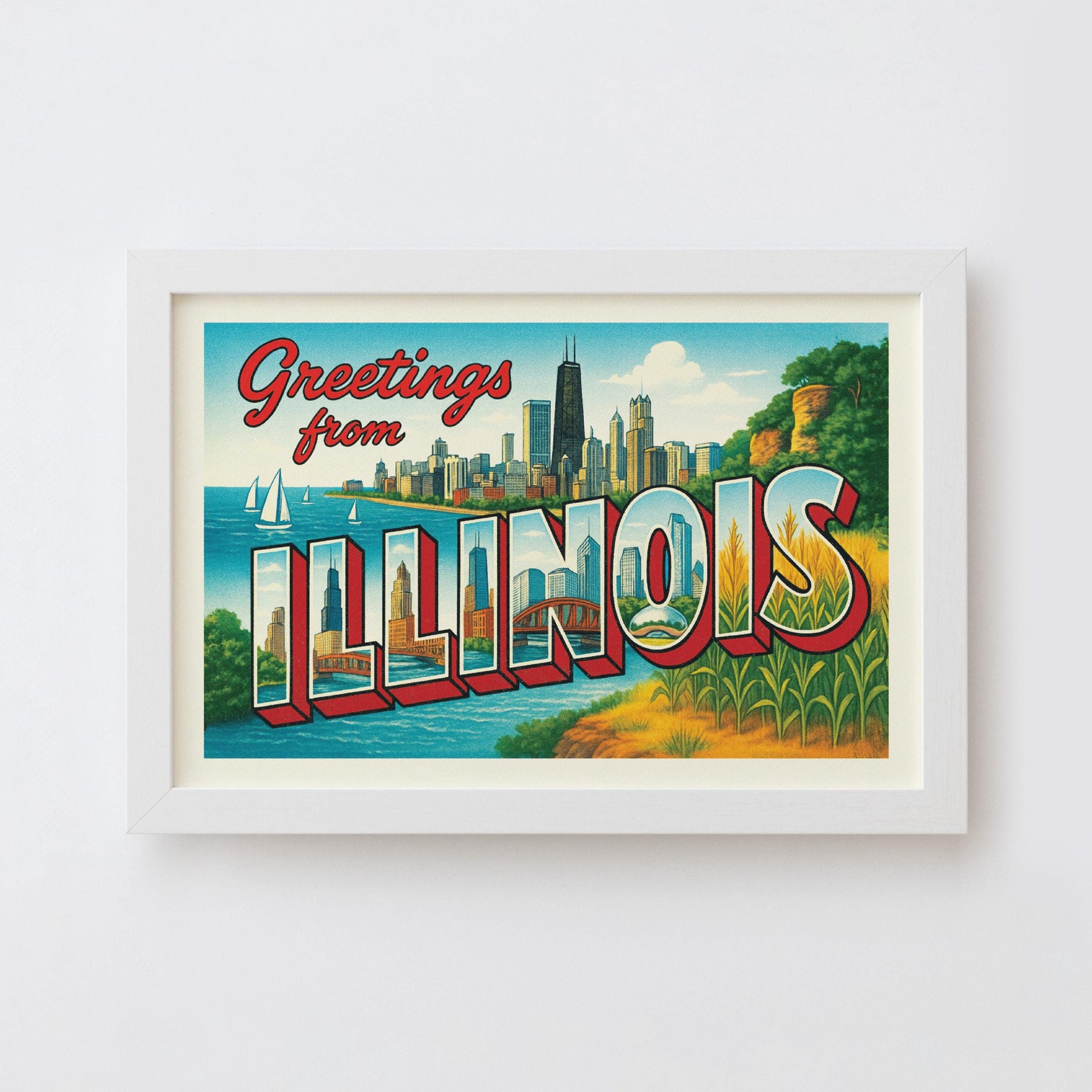 Bring a touch of classic Americana into your home with this “Greetings from Illinois” vintage postcard style print. Featuring bold retro lettering and iconic imagery from the Prairie State—Chicago’s skyline, Lake Michigan, historic architecture, bridges, and golden cornfields—this piece is perfect for travelers, collectors, and anyone who loves Illinois pride.