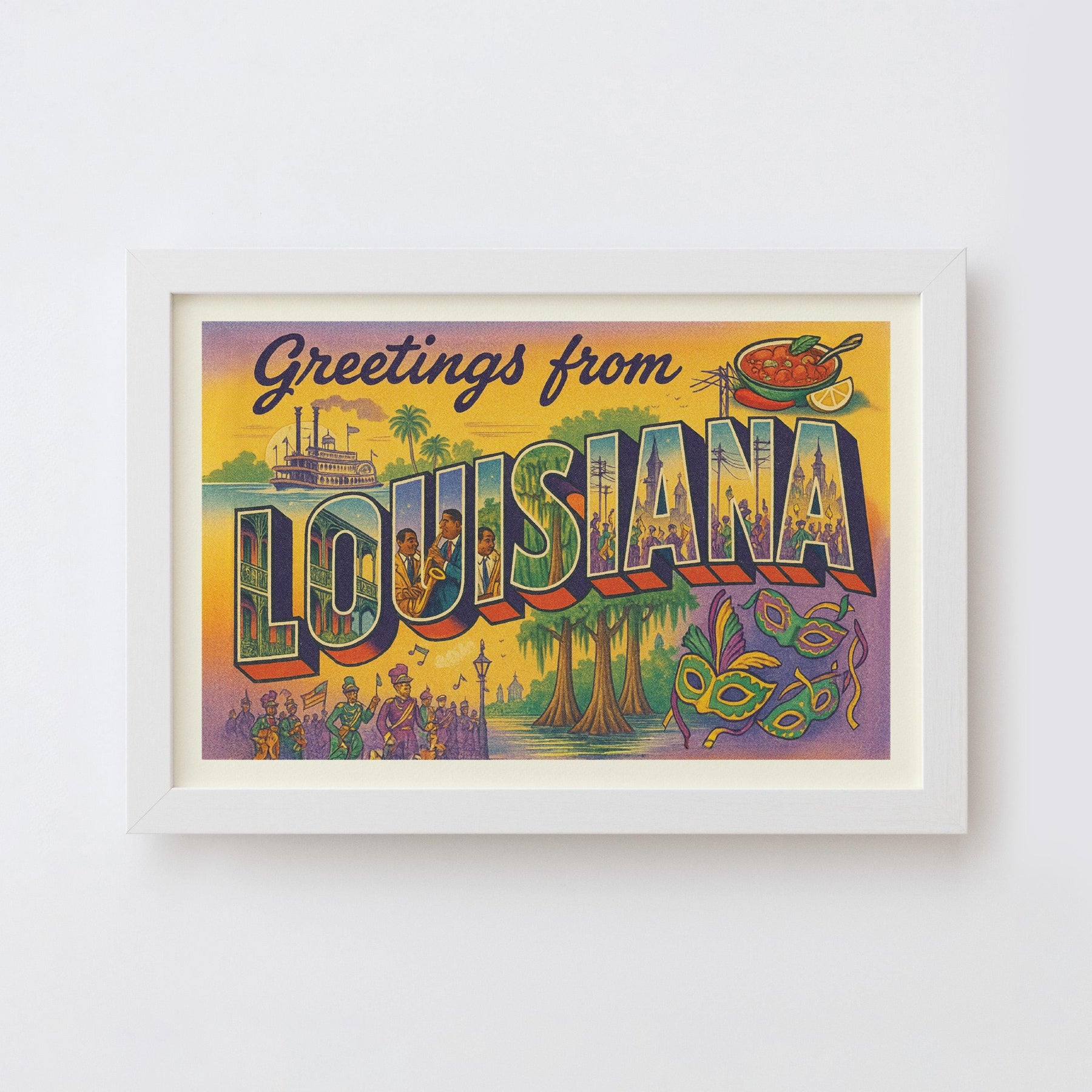 Bring a touch of classic Americana into your home with this “Greetings from Louisiana” vintage postcard style print. Featuring bold retro lettering and iconic imagery from the Pelican State—steamboats, jazz musicians, Mardi Gras parades, cypress swamps, and Cajun cuisine—this piece is perfect for travelers, collectors, and anyone who loves Louisiana pride.