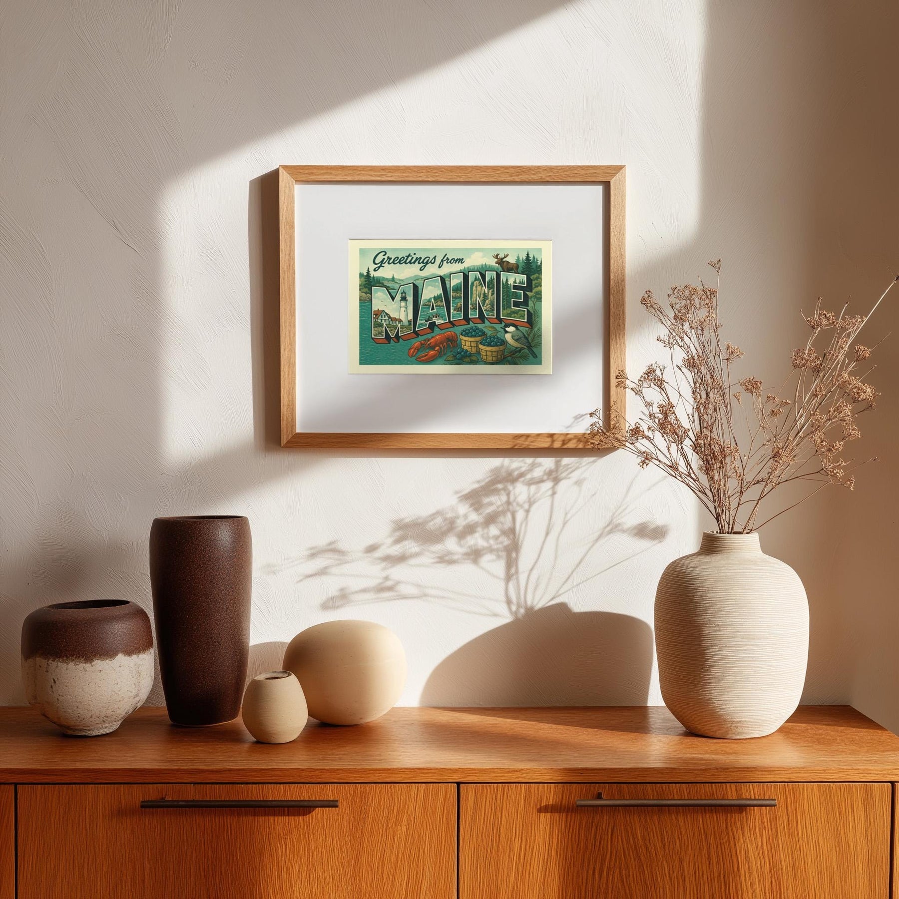 Bring a touch of classic Americana into your home with this “Greetings from Maine” vintage postcard style print. Featuring bold retro lettering and iconic imagery from the Pine Tree State—rocky coastlines, historic lighthouses, wild blueberries, lobster, moose, and chickadees—this piece is perfect for travelers, collectors, and anyone who loves Maine pride.