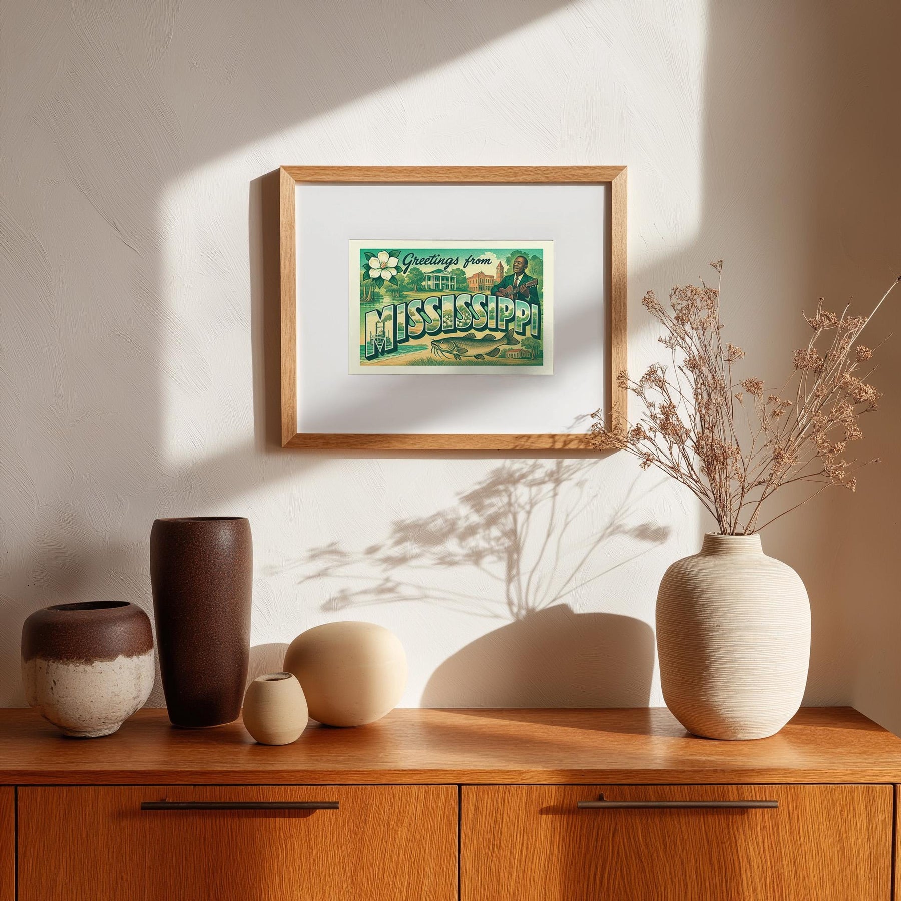 Bring a touch of classic Americana into your home with this “Greetings from Mississippi” vintage postcard style print. Featuring bold retro lettering and iconic imagery from the Magnolia State—riverboats on the Mississippi, blooming magnolias, catfish, historic architecture, and the rich legacy of blues music—this piece is perfect for travelers, collectors, and anyone who loves Mississippi pride.
