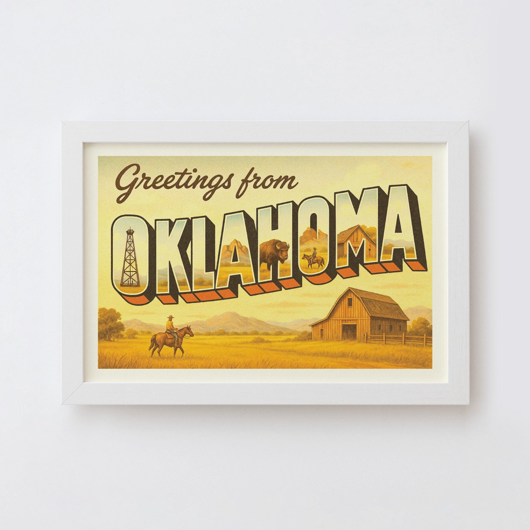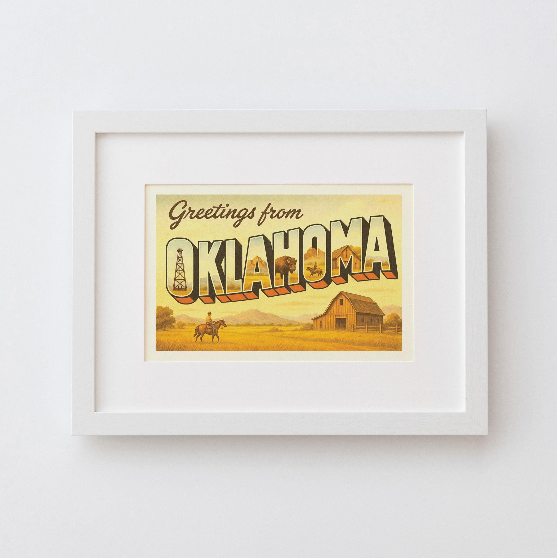 Bring a touch of classic Americana into your home with this “Greetings from Oklahoma” vintage postcard style print. Featuring bold retro lettering and iconic imagery from the Sooner State—open prairies, oil rigs, Route 66, Native heritage, and Western traditions—this piece is perfect for travelers, collectors, and anyone who loves Oklahoma pride.