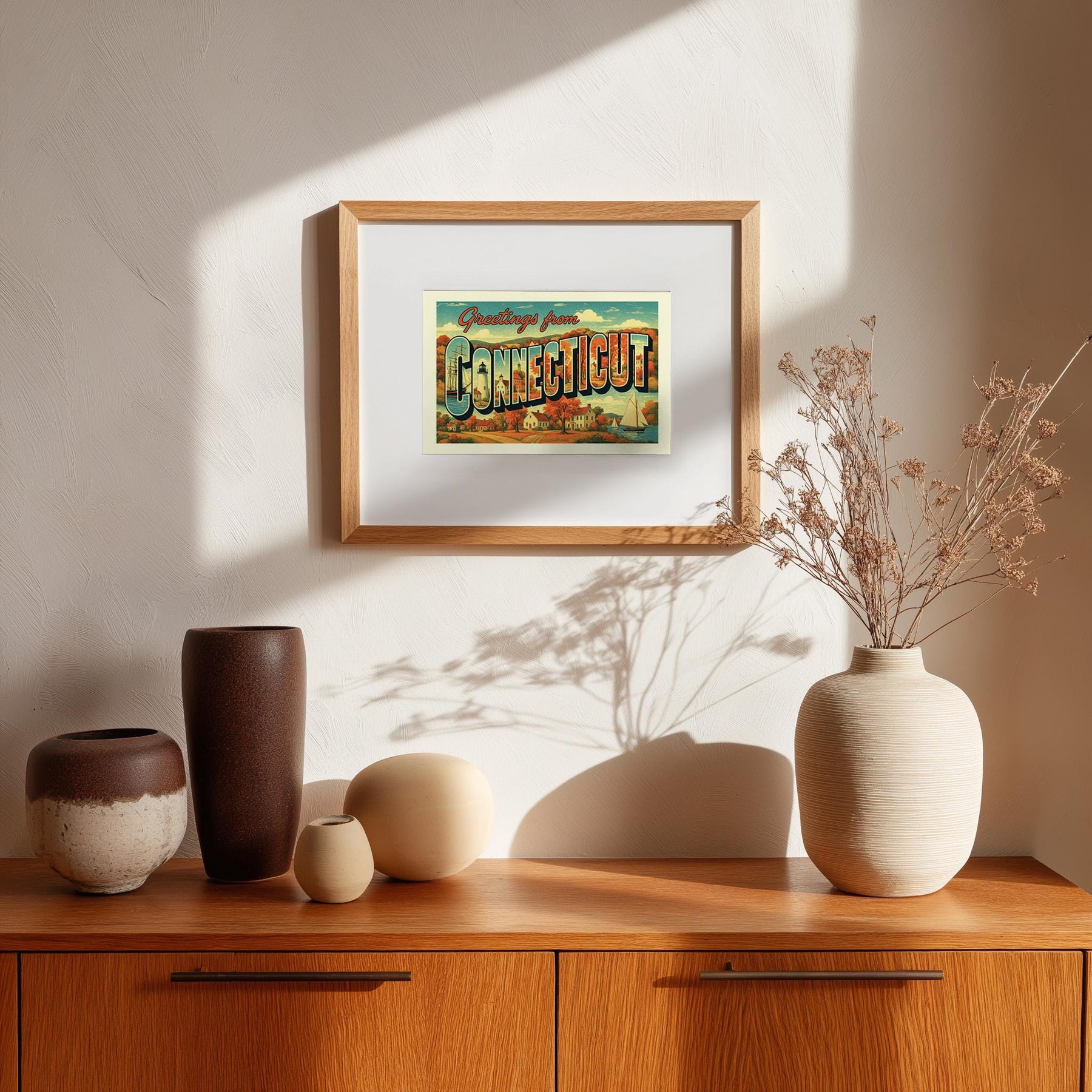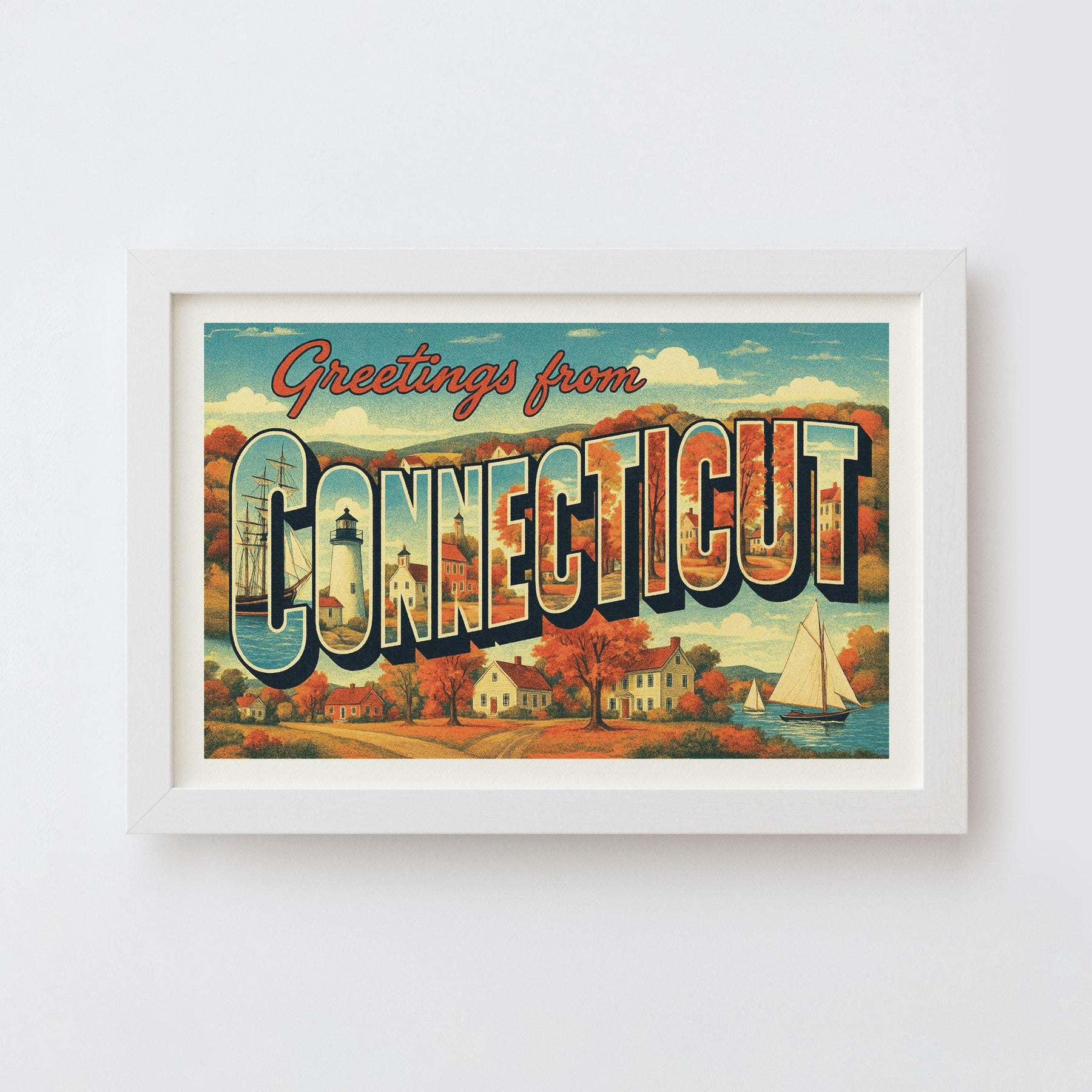 Bring a touch of classic Americana into your home with this “Greetings from Connecticut” vintage postcard style print. Featuring bold retro lettering and iconic imagery from the Constitution State—sailing ships, historic lighthouses, charming New England villages, and colorful autumn landscapes—this piece is perfect for travelers, collectors, and anyone who loves Connecticut pride.