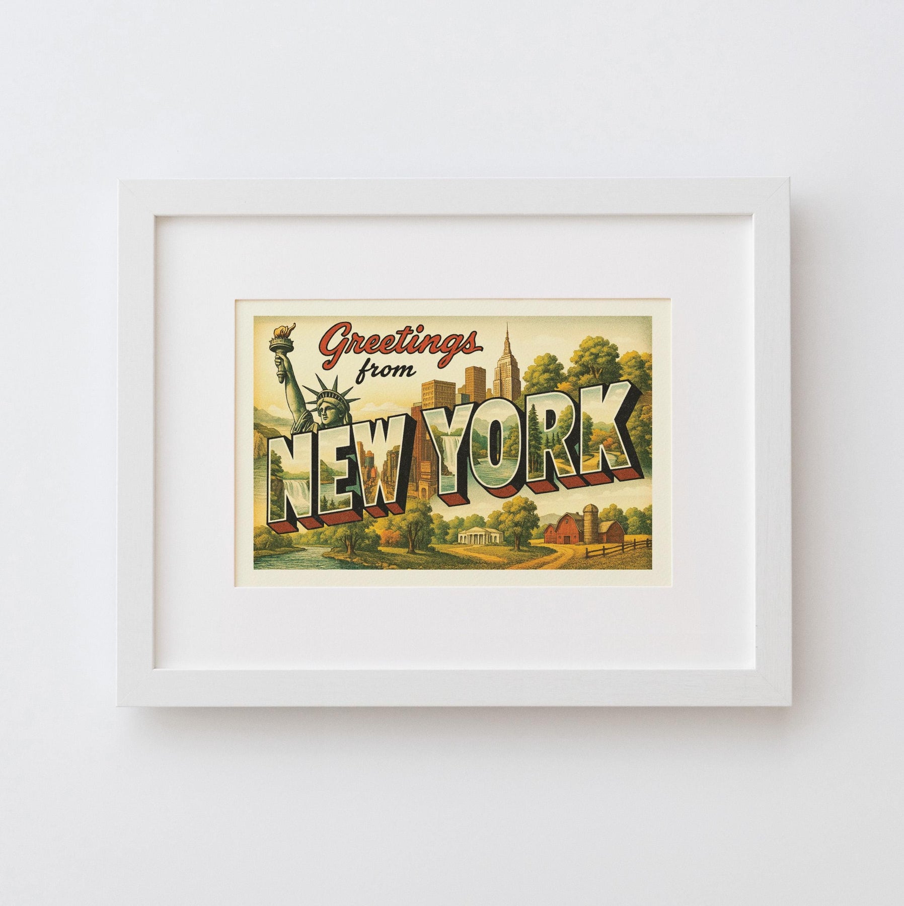Bring a touch of classic Americana into your home with this “Greetings from New York” vintage postcard style print. Featuring bold retro lettering and iconic imagery from the Empire State—New York City skyscrapers, the Statue of Liberty, Niagara Falls, the Adirondacks, and Broadway lights—this piece is perfect for travelers, collectors, and anyone who loves New York pride.