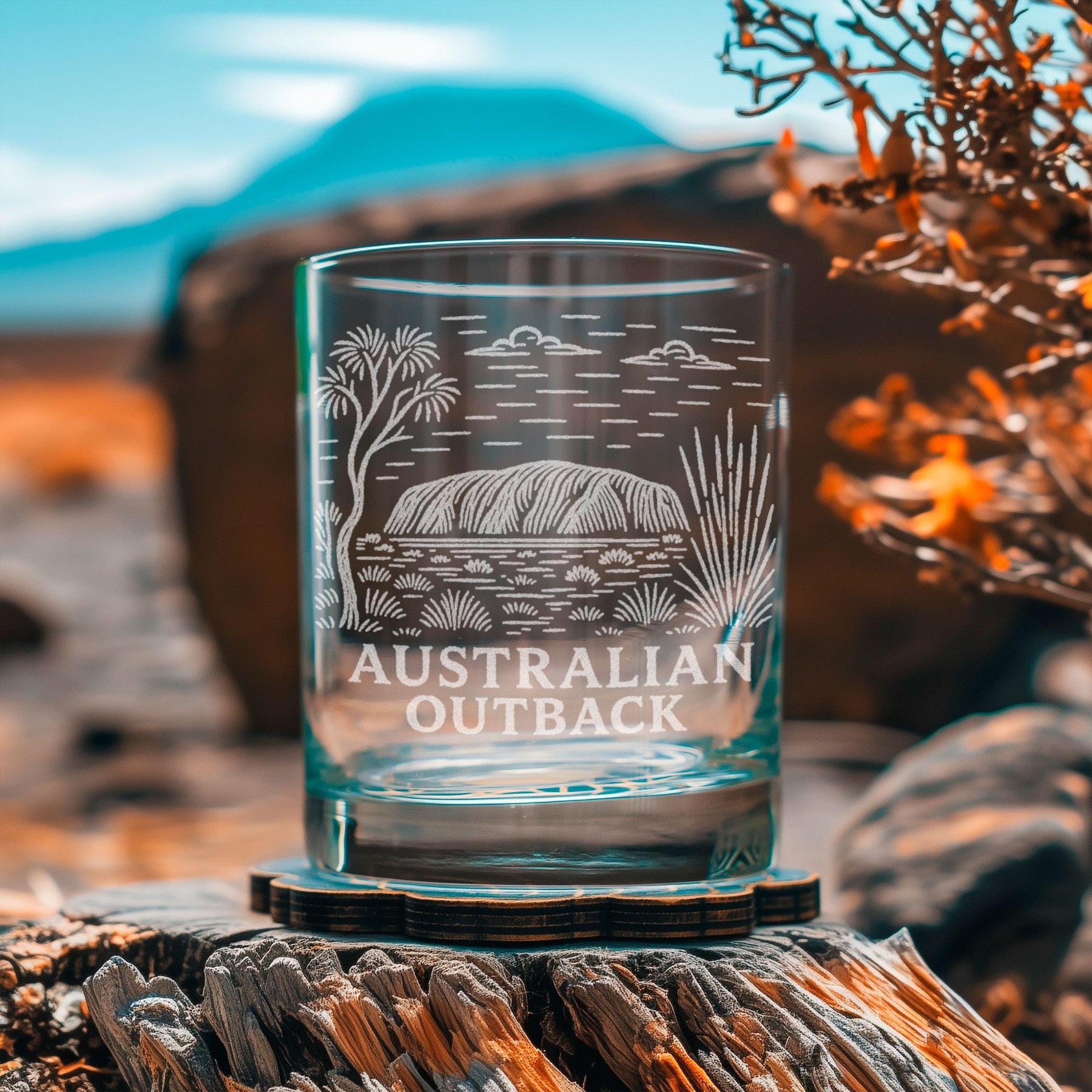 Capture the rugged beauty and wide-open wonder of the Australian Outback with this finely engraved glass. Featuring iconic red-desert terrain, rocky formations rising in the distance, hardy native plants, and the quiet sweep of open sky, this design reflects the vastness and timeless spirit of Australia’s most legendary landscape. Etched in a vintage-inspired style, every line evokes the heat, stillness, and raw natural power that define the Outback.