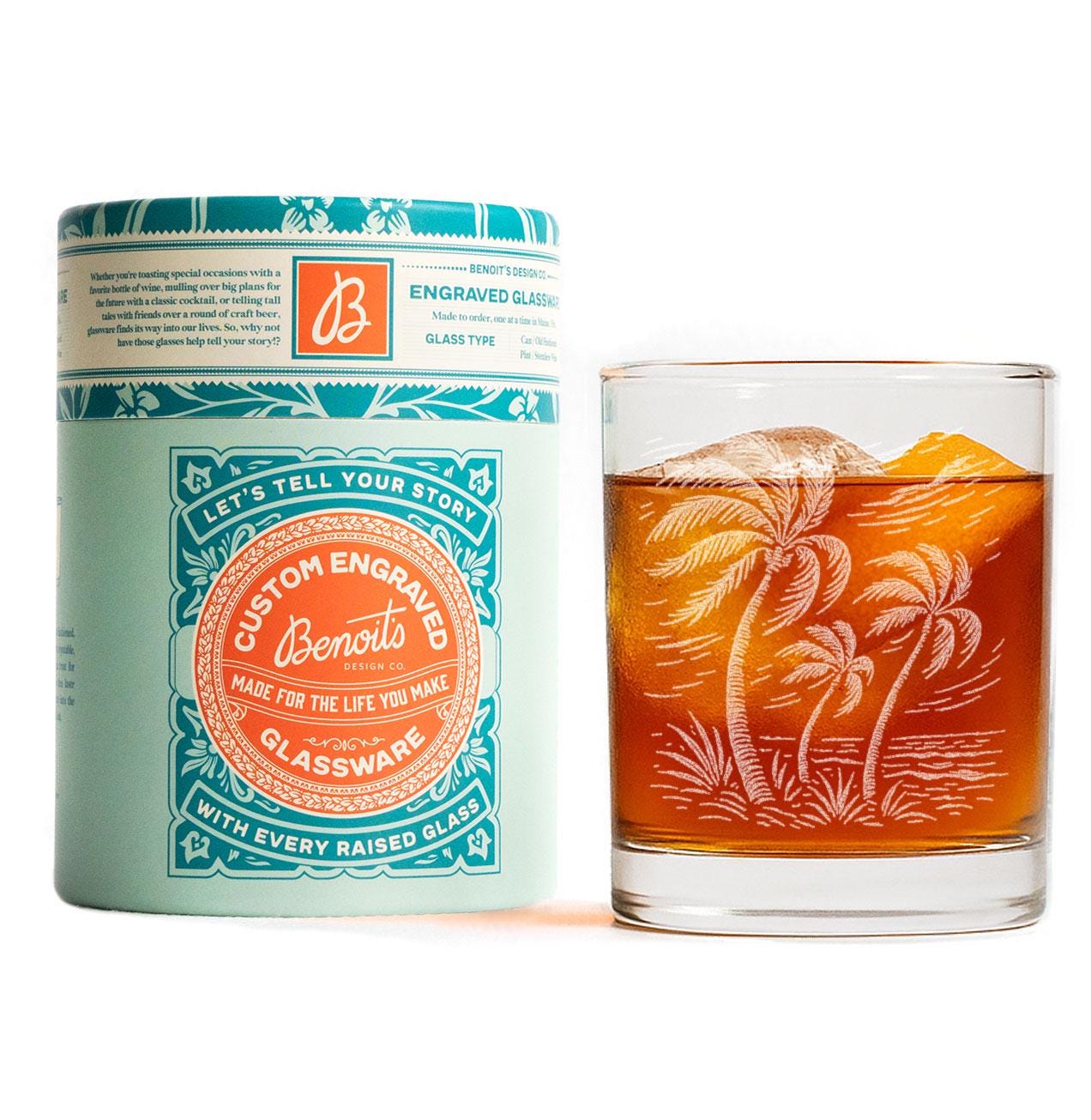 Each glass is etched in our Maine studio for crisp artwork that won’t fade or wash away. Whether you're sipping iced tea, sangria, cocktails, or a cold beer after a long day, this palm-filled scene adds sunny, vacation-ready charm to every pour.
