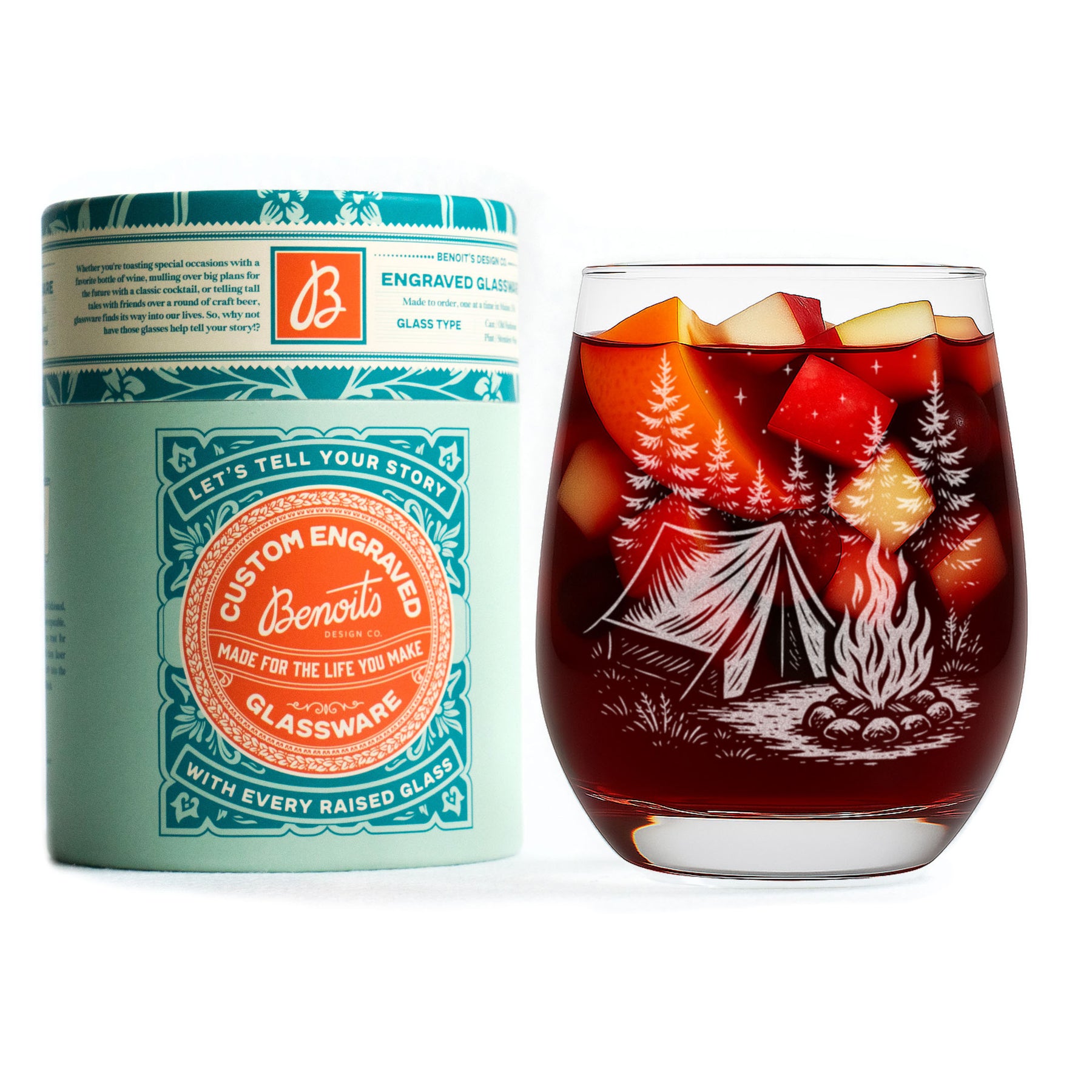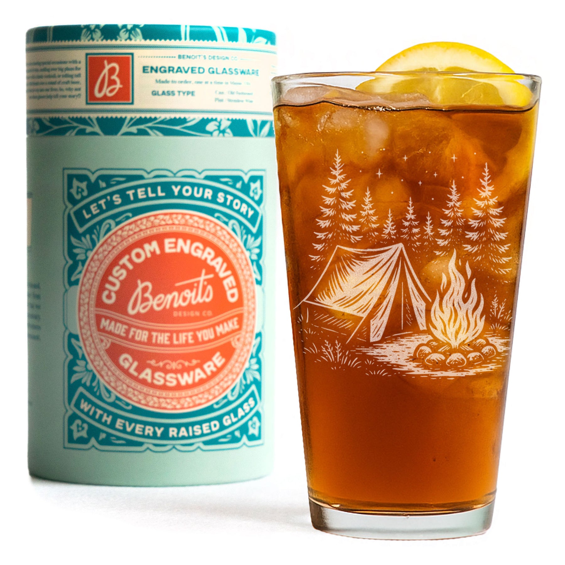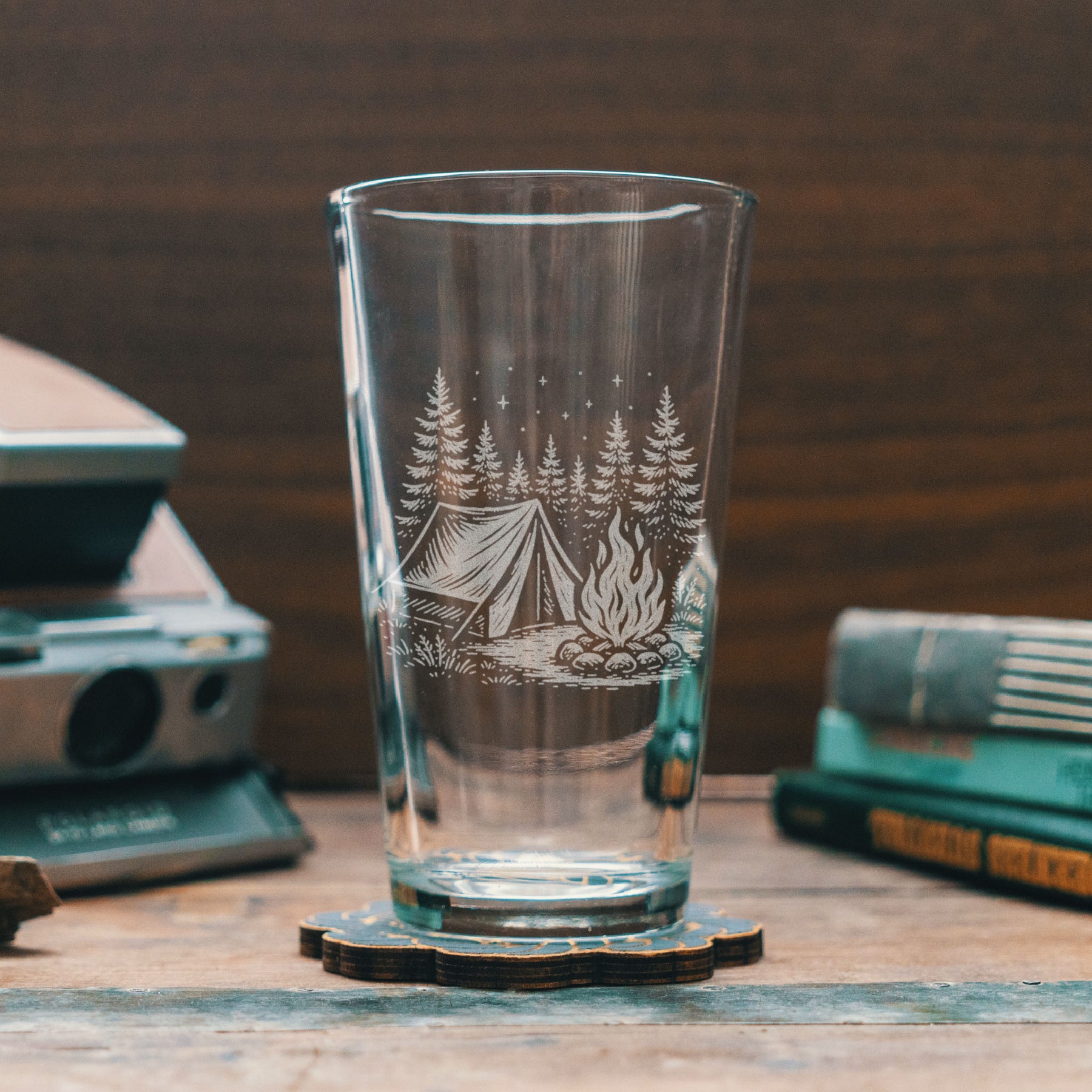 There’s nothing quite like a night under the pines. This glass captures the magic of the great outdoors—etched with a detailed camping scene featuring a tent, a crackling campfire, and a starry sky framed by tall evergreens. It’s an ode to s’mores and starlight, the smell of woodsmoke, and the quiet moments shared around the fire.