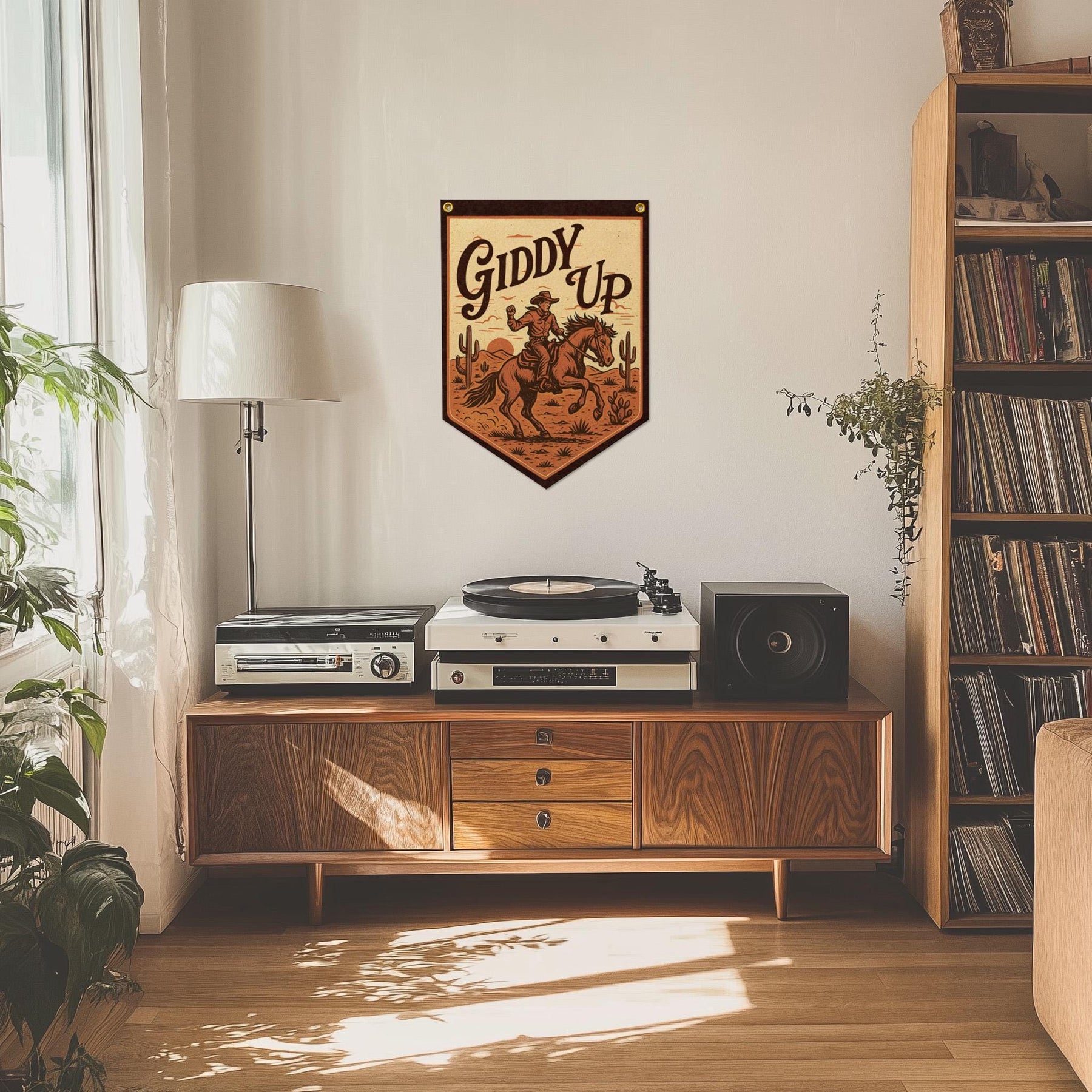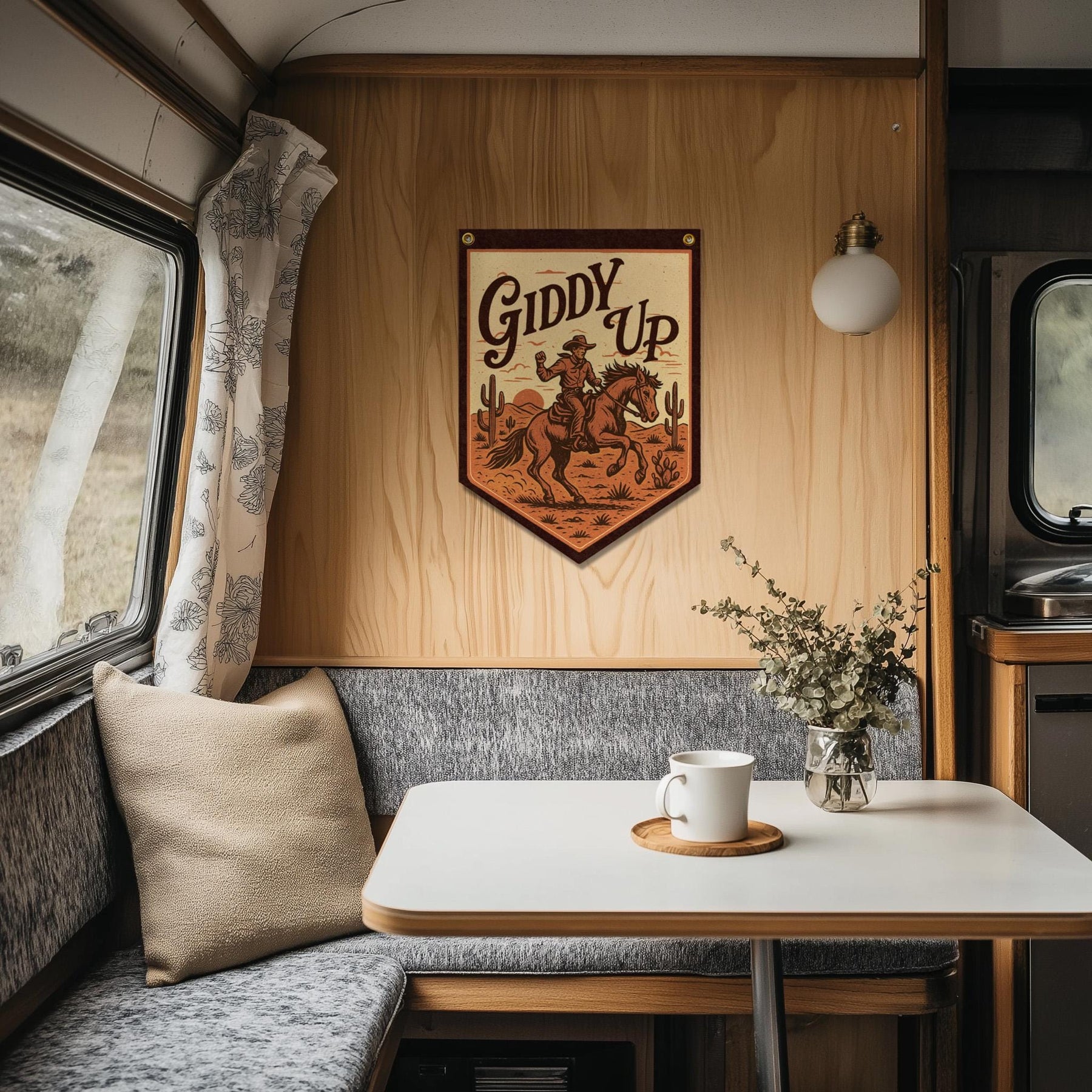 Saddle up and add some yeehaw to your space with our Giddy Up Felt Camp Flag! Designed with a nod to vintage Western flair, this bold banner brings big cowboy energy to nurseries, kids' rooms, or any spot that could use a little extra giddy in its up. Whether you're raising a little buckaroo or just love a good rodeo vibe, this felt flag is a fun way to round up charm and character in one easy-to-hang piece.