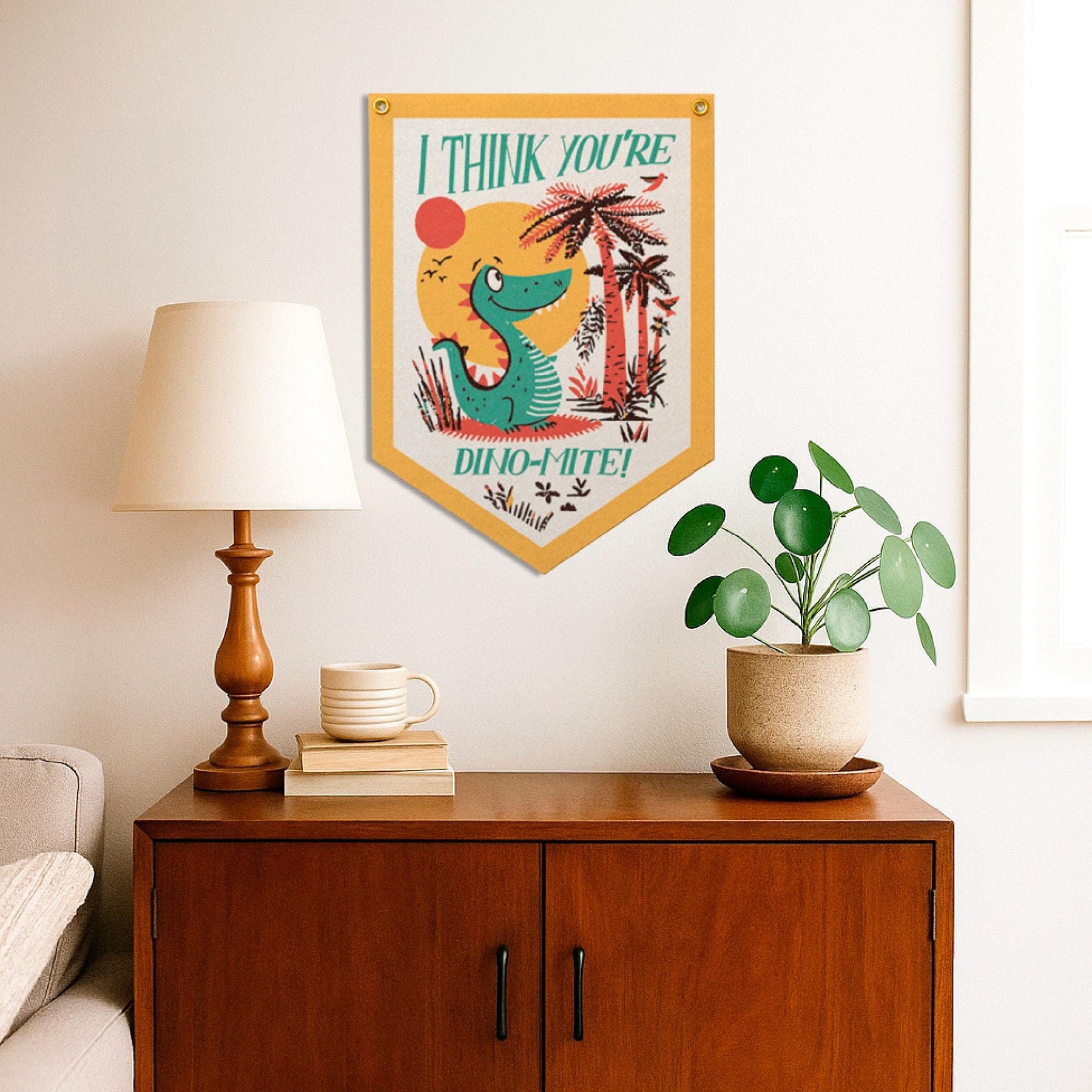 Celebrate your love for dinosaurs with this unique felt pennant flag that blends humor and style effortlessly. The I Think You're Dino-Mite Felt Camp Flag is more than just a dinosaur room decor piece—it’s a conversation starter backed by quality craftsmanship and positive customer reviews praising its charm and durability. Add this funny jurassic banner to your collection of hanging wall decor today and bring prehistoric joy to your home or gift-giving occasions.
