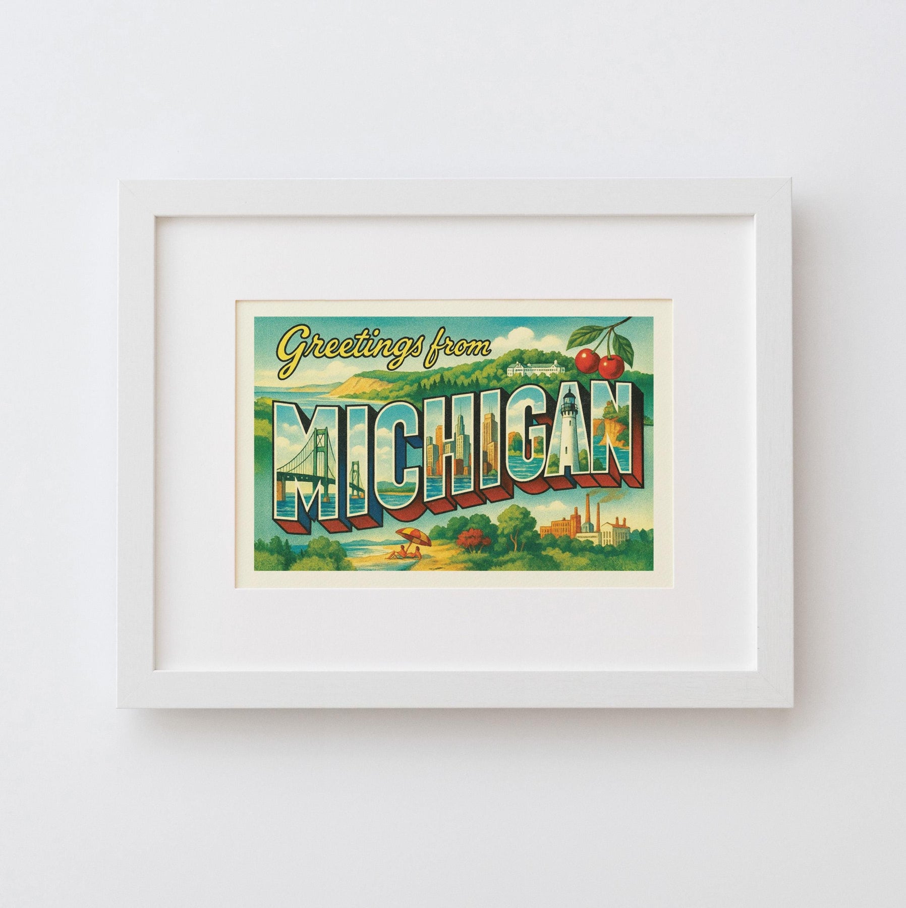 Bring a touch of classic Americana into your home with this “Greetings from Michigan” vintage postcard style print. Featuring bold retro lettering and iconic imagery from the Great Lakes State—the Mackinac Bridge, lighthouses, cherry orchards, sandy beaches, Detroit’s skyline, and historic landmarks—this piece is perfect for travelers, collectors, and anyone who loves Michigan pride.