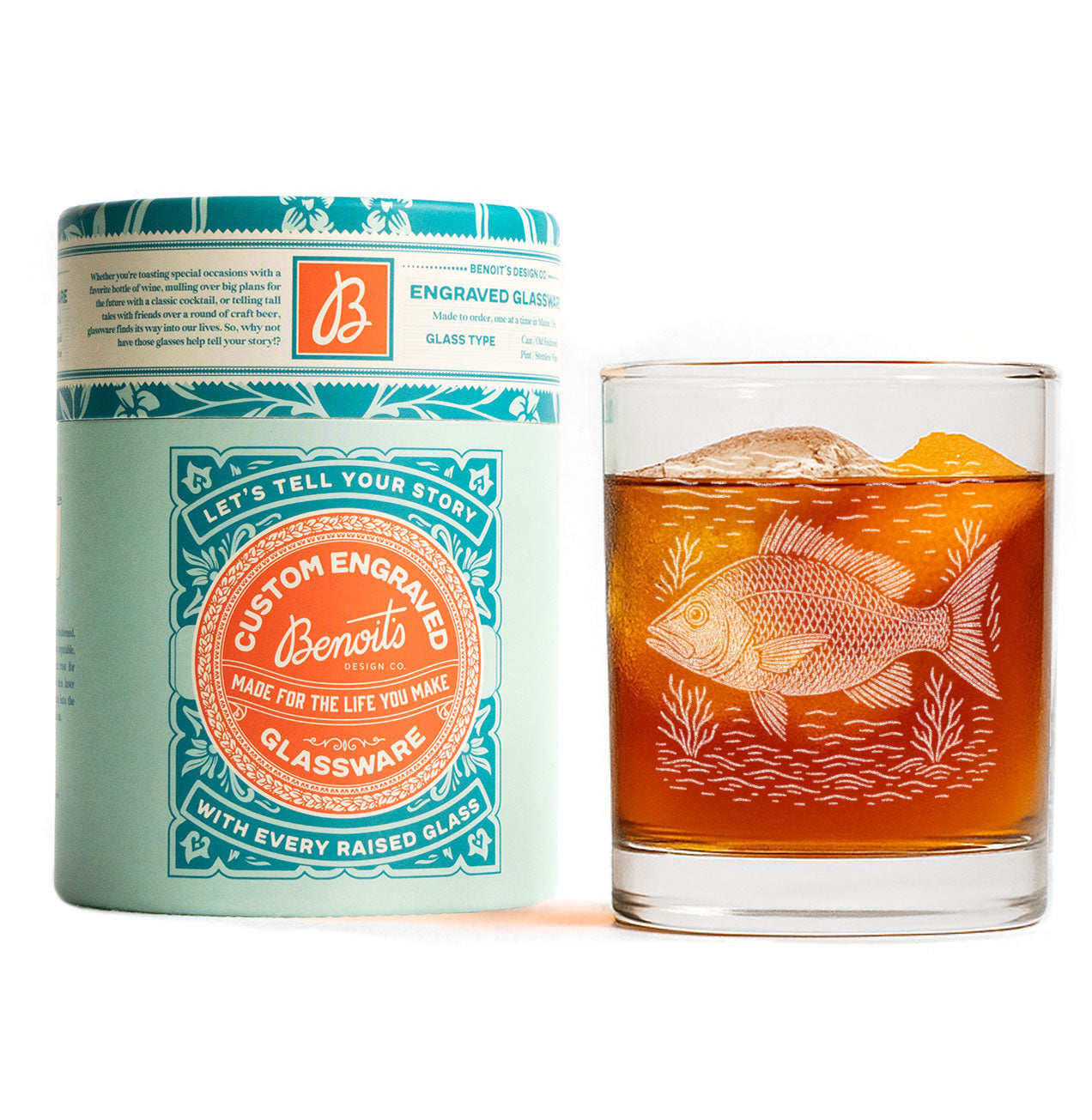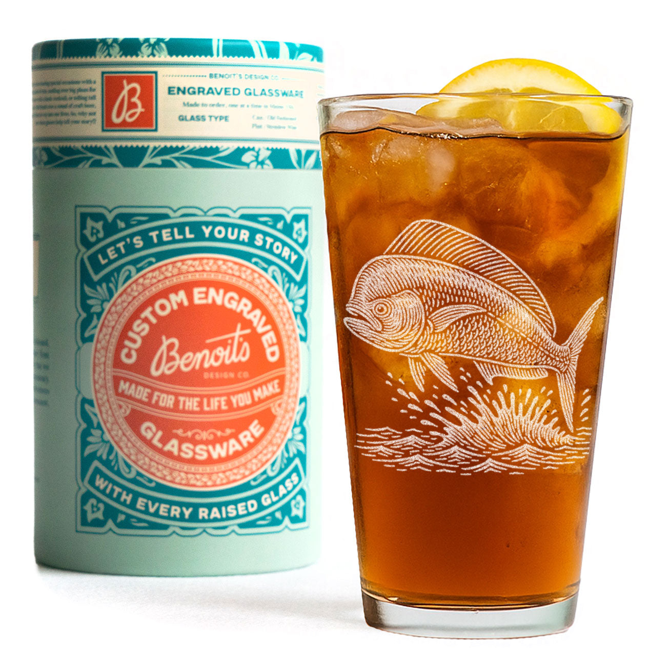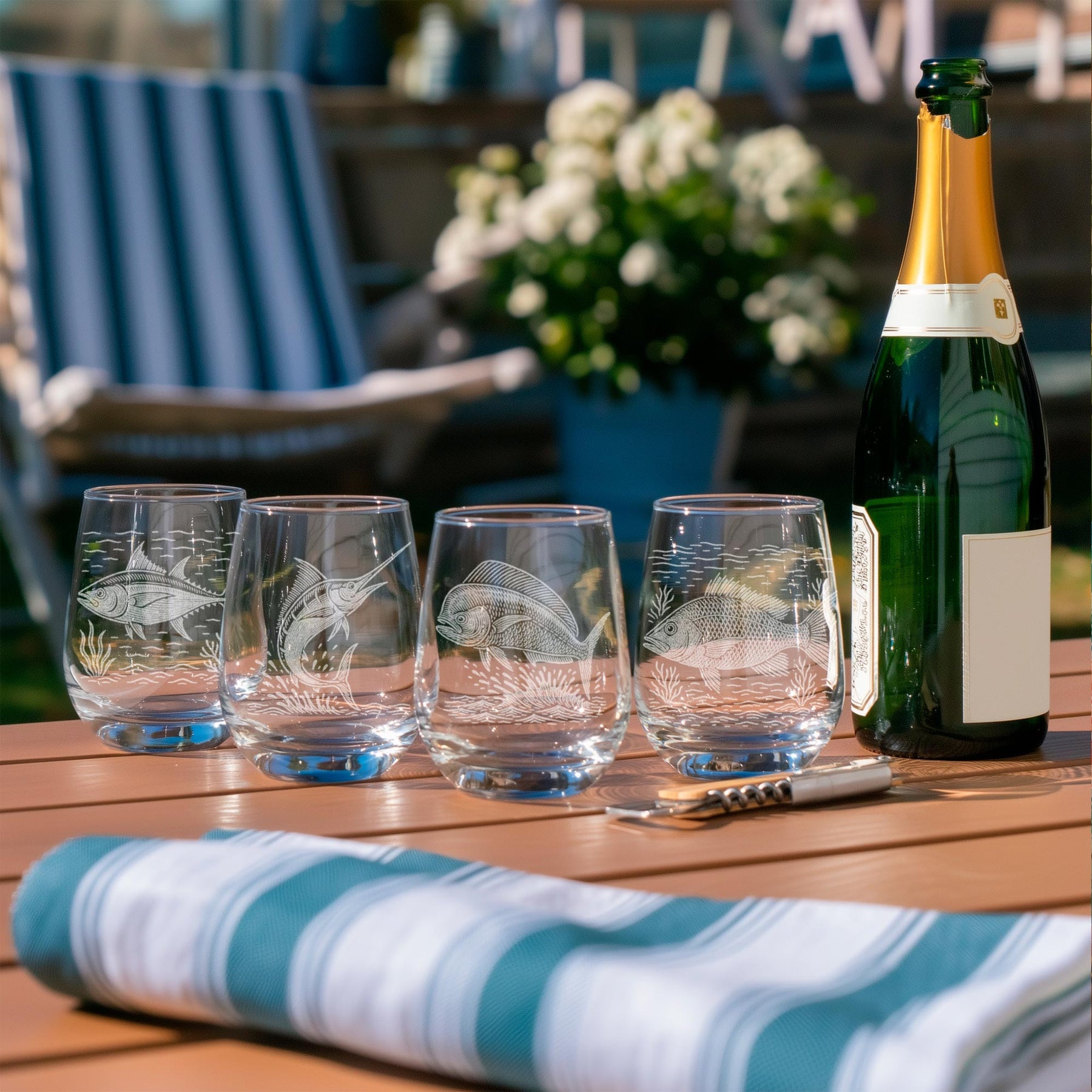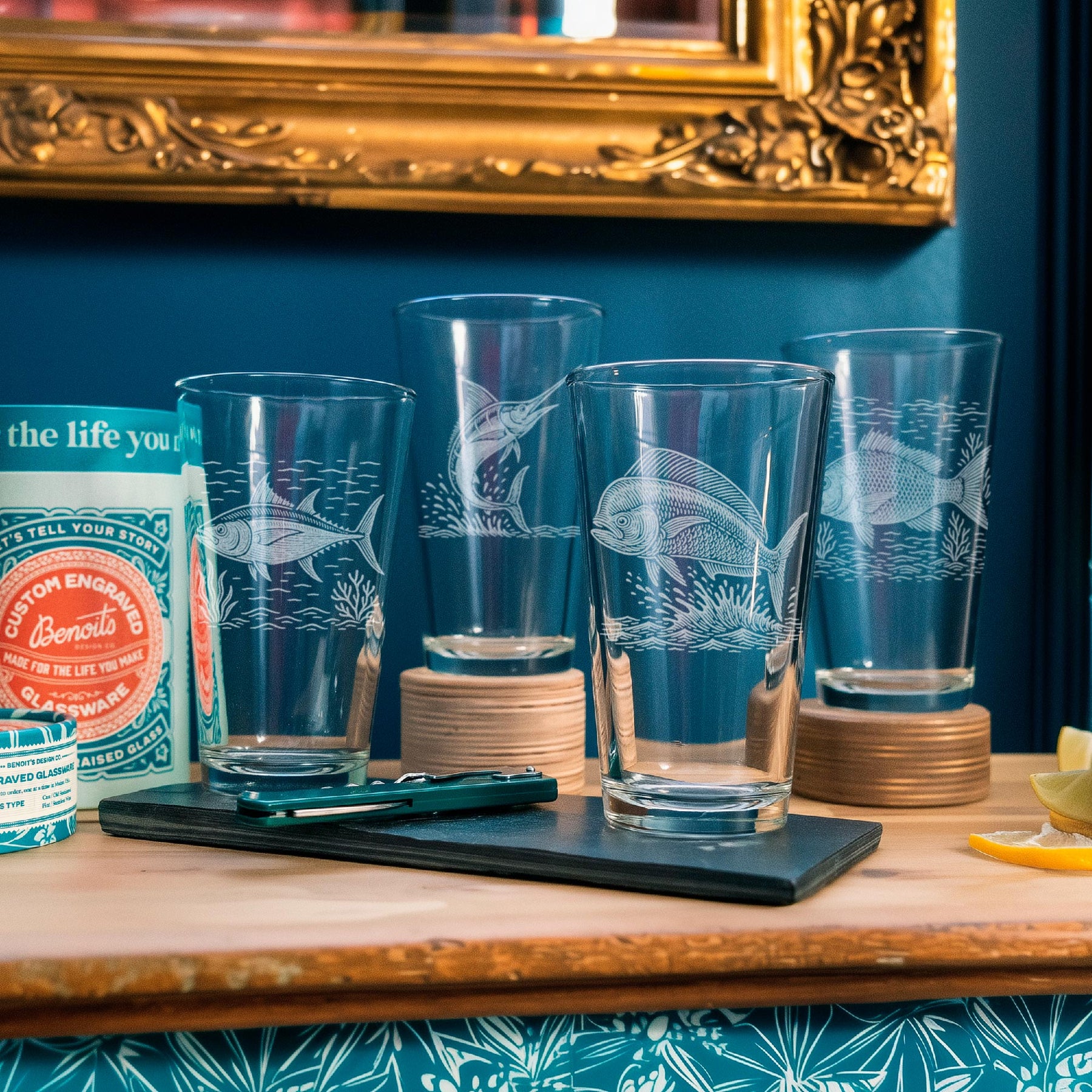 Each glass showcases a different species, beautifully etched for lasting detail that won’t fade or wash away. From cocktails to sparkling water, these iconic fish add a spirited, salt-air feel to every glass. Whether kept as a set or gifted individually, this collection brings the character of the open water right to your home bar.