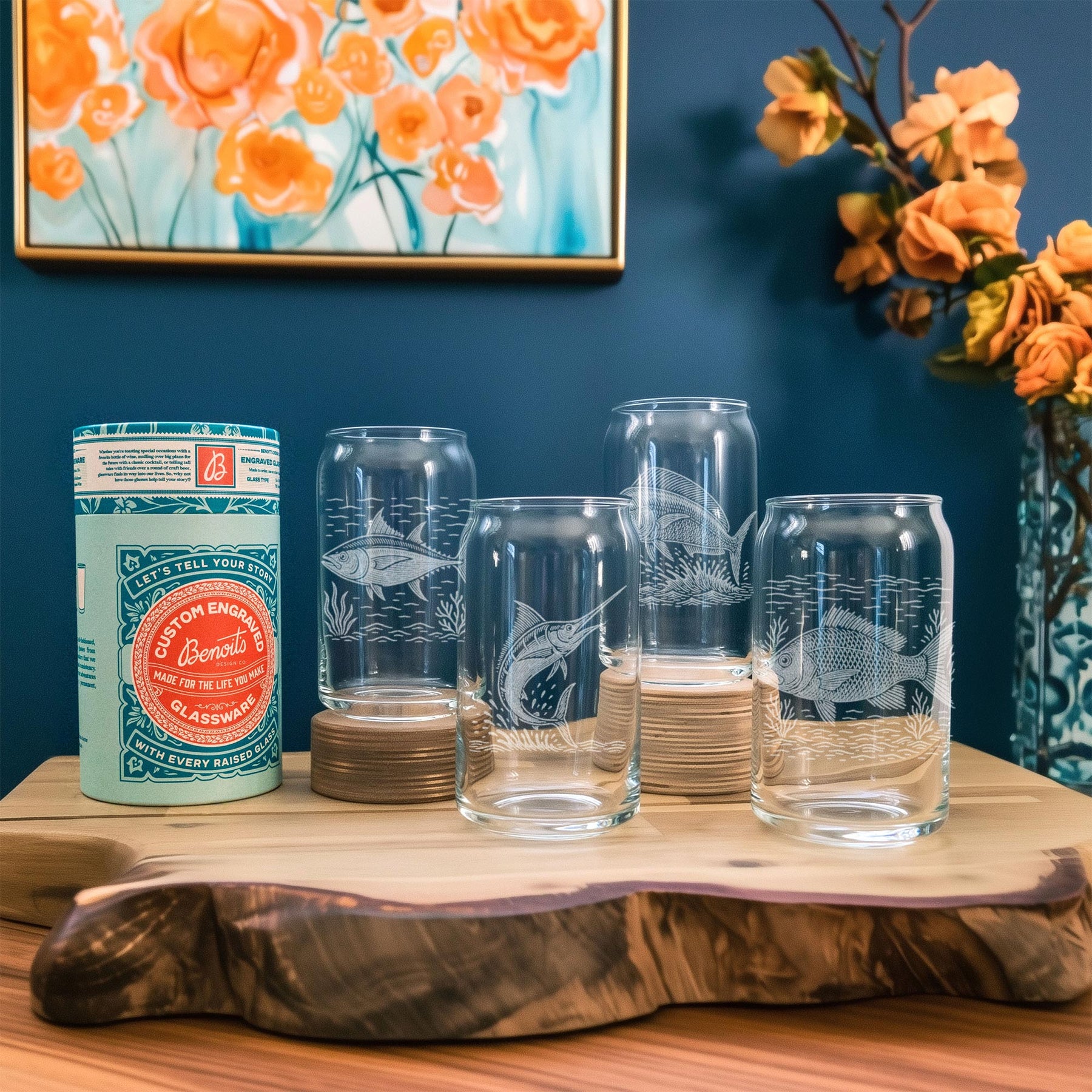 Bring bold offshore beauty to every pour with our Ocean Icons Fish Glass Set. Featuring four finely detailed laser-etched fish—Marlin, Tuna, Mahi Mahi, and Red Snapper—this collection blends dramatic silhouettes with crisp, ocean-inspired linework. Perfect for anglers, coastal décor lovers, and anyone who appreciates classic nautical artwork.