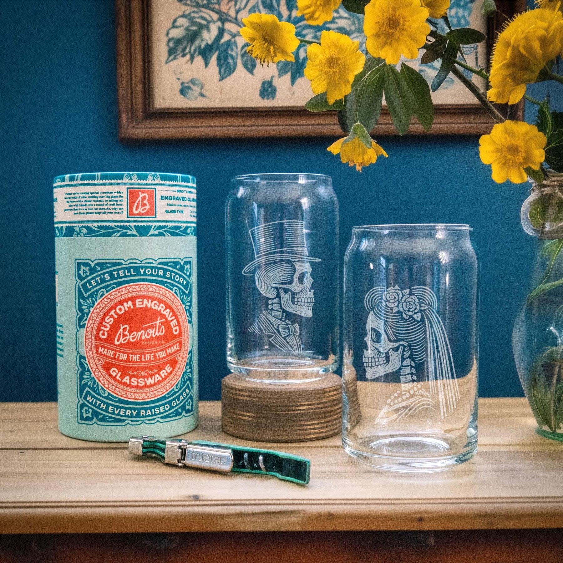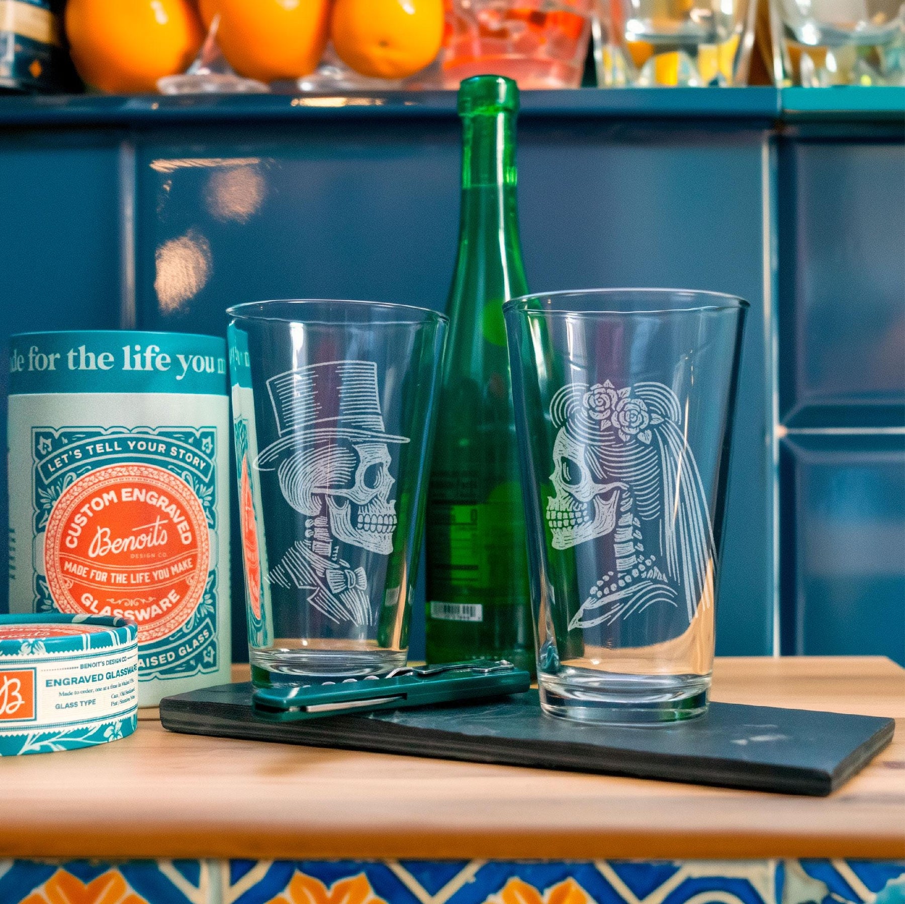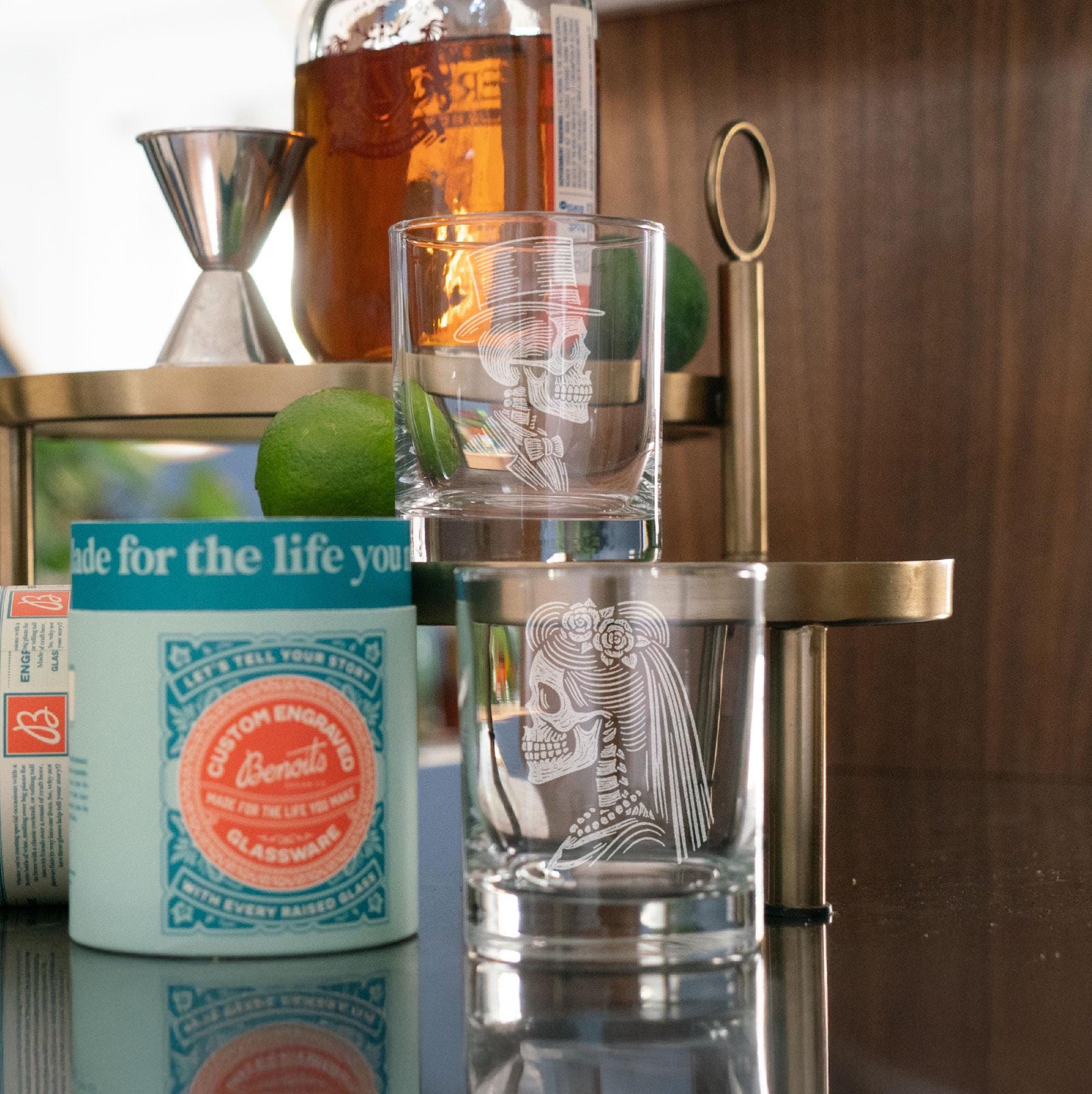 Celebrate timeless love with a touch of spooky charm. This engraved pair of glasses features a dapper skeleton gentleman in his top hat and bow tie, paired with his elegant skeletal bride adorned with roses and pearls — a perfect duo for anyone who appreciates romance with a gothic twist. A memorable gift for couples, newlyweds, Halloween lovers, Día de los Muertos enthusiasts, or anyone who believes love lasts well beyond this lifetime. Cheers to forever — and then some.