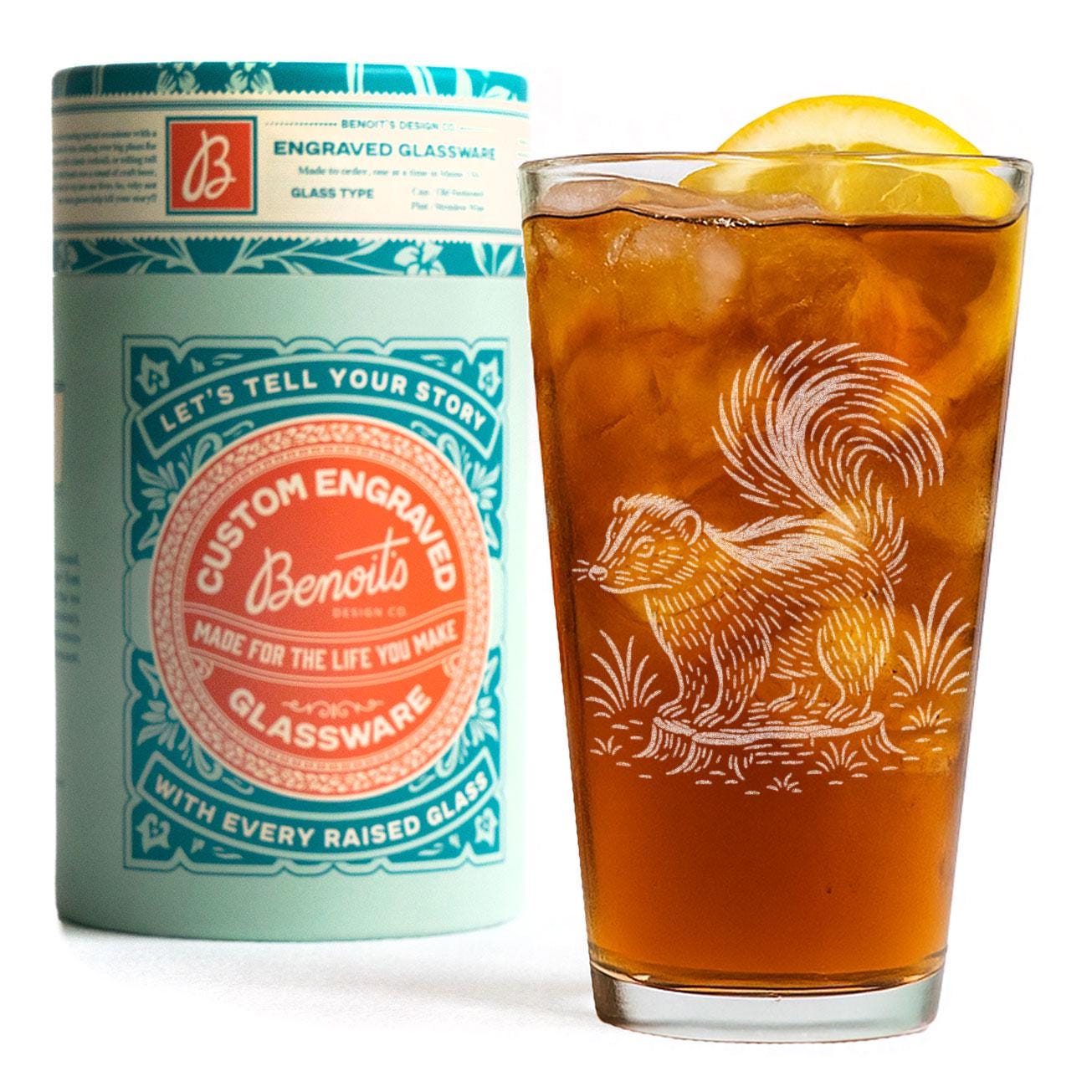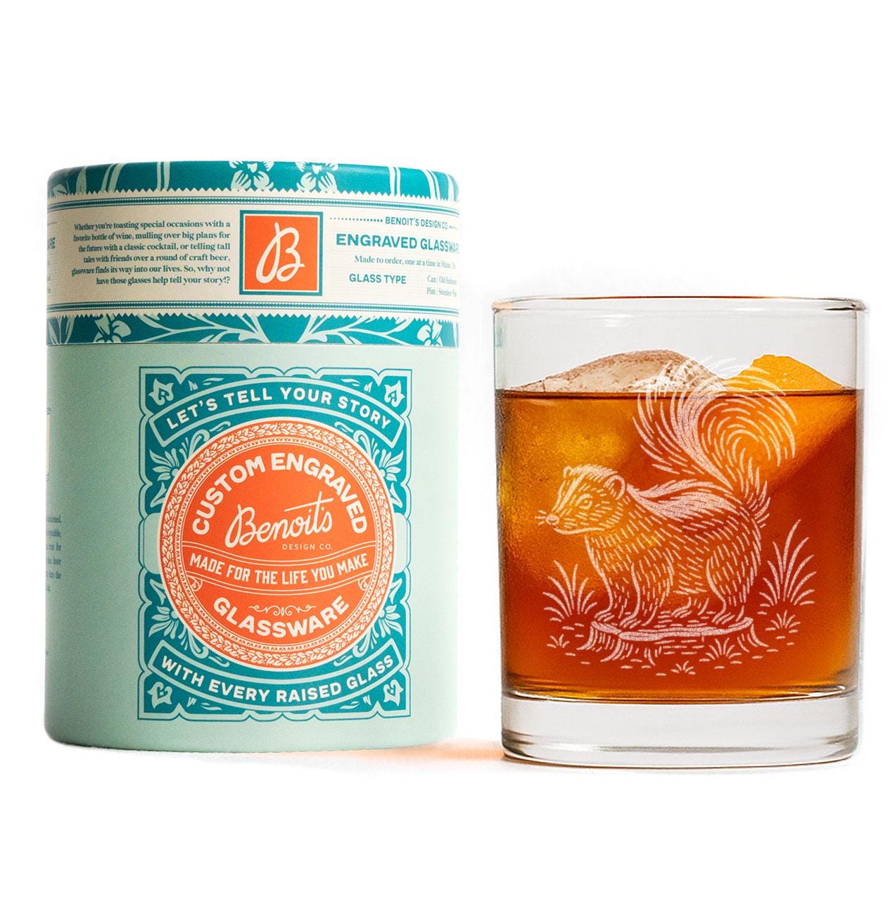 Add a touch of woodland whimsy to every glass with our Skunk Glass. This finely detailed laser-etched illustration features a fluffy-tailed skunk standing proudly in a forest scene — perfect for nature lovers, hikers, cabin owners, and anyone who enjoys a little character with their cocktails.