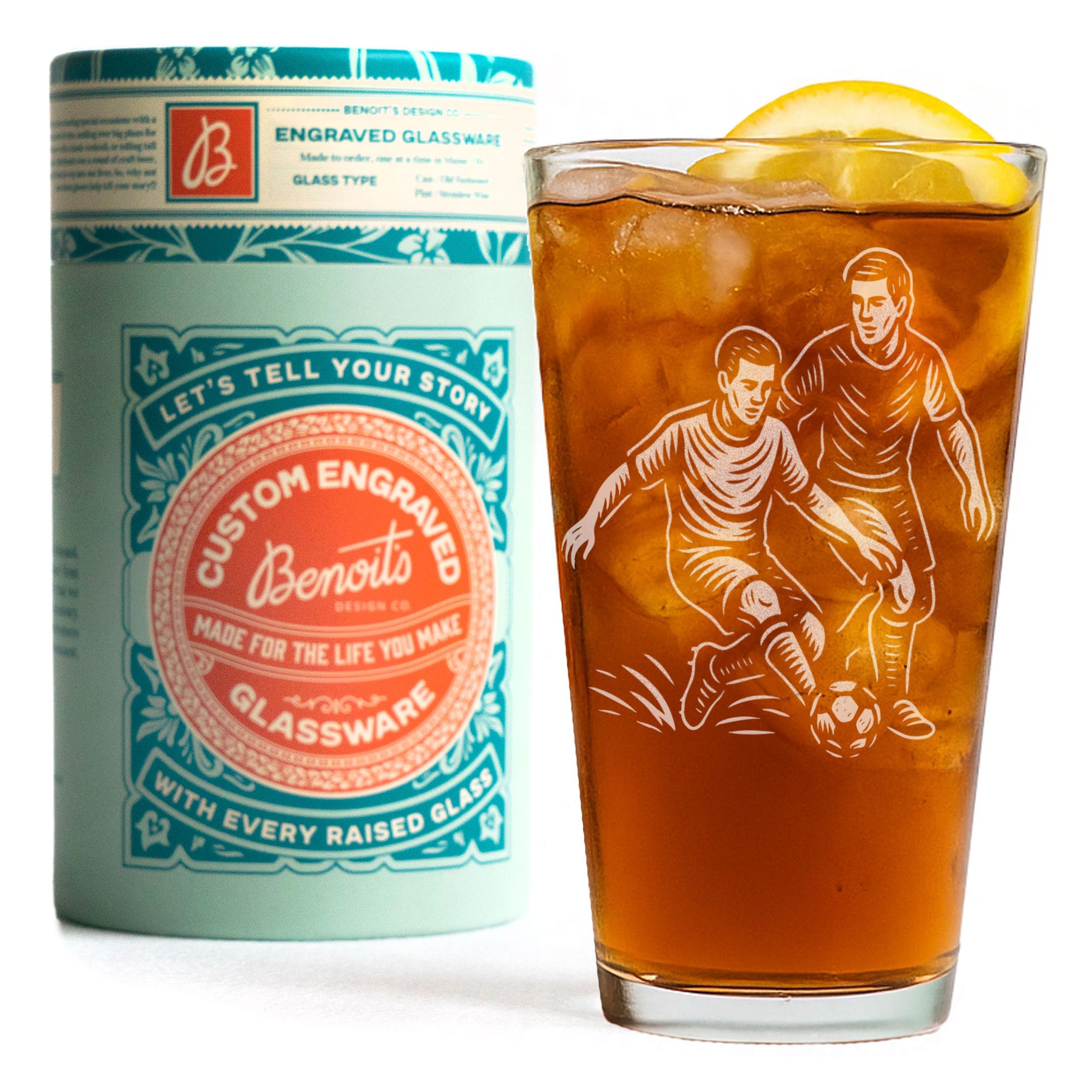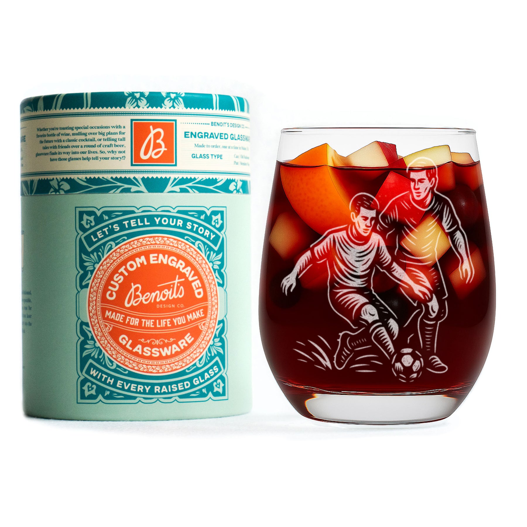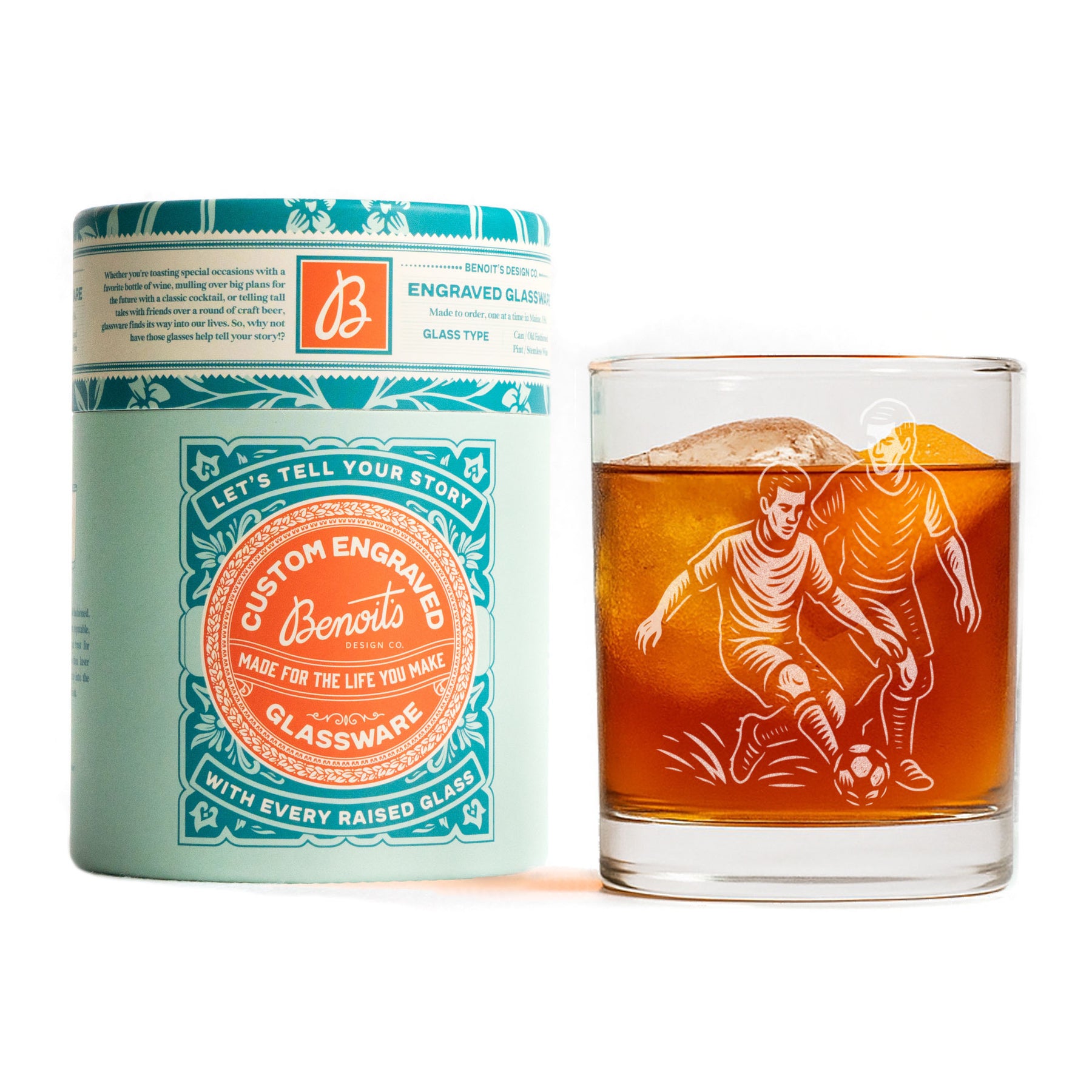A nod to the world’s game, frozen in a classic moment of motion. This glass features a finely detailed engraving of two players in mid-match — the instant before the goal. It’s a timeless design that captures the energy and camaraderie of the pitch, whether you’re celebrating a win or unwinding after the game.