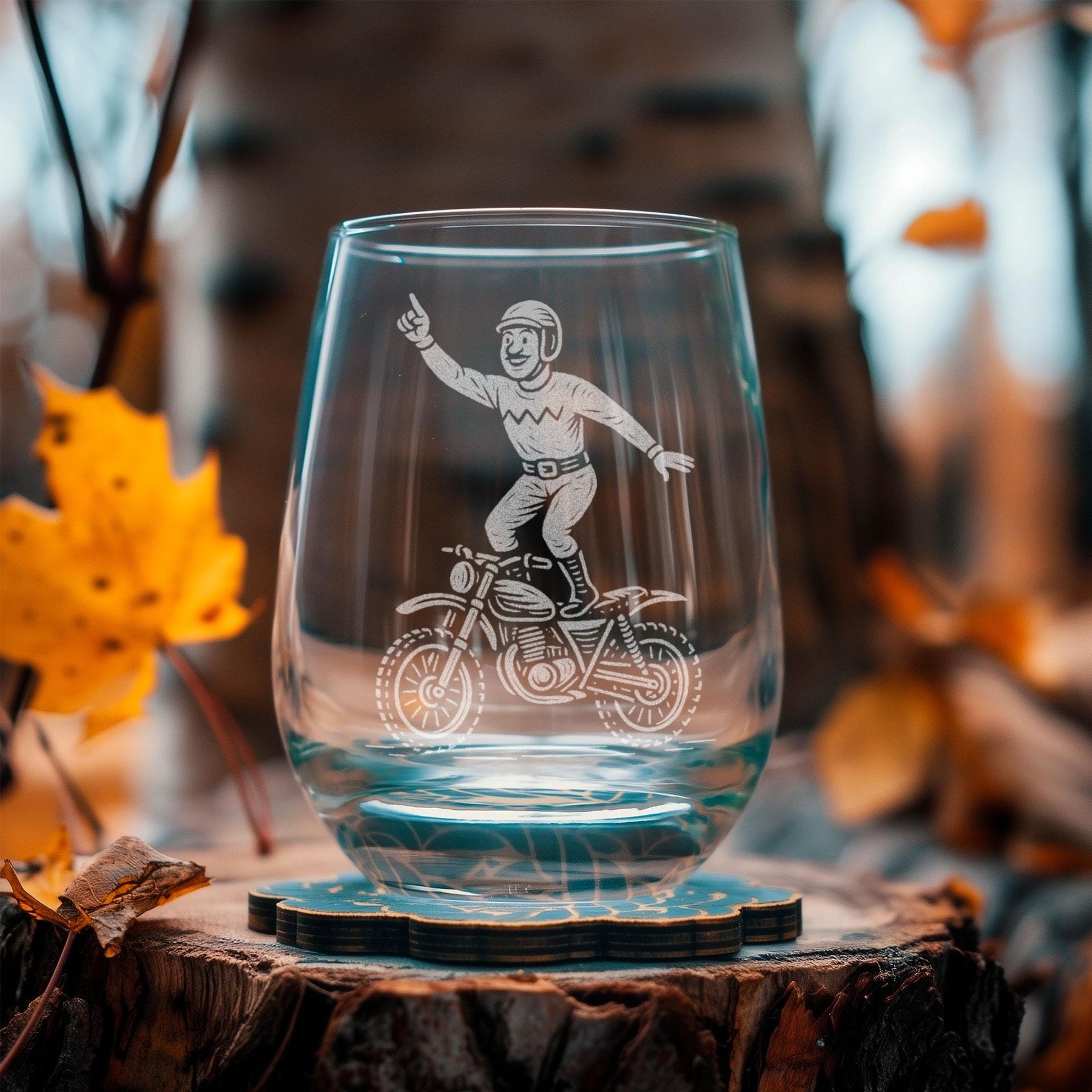 Raise a glass to the bold, the brave, and the ones who live life full throttle. Our Stunt Man Glass features a playful, laser-etched illustration of a retro daredevil standing triumphantly atop a vintage motorcycle — the perfect blend of grit, nostalgia, and fearless fun.