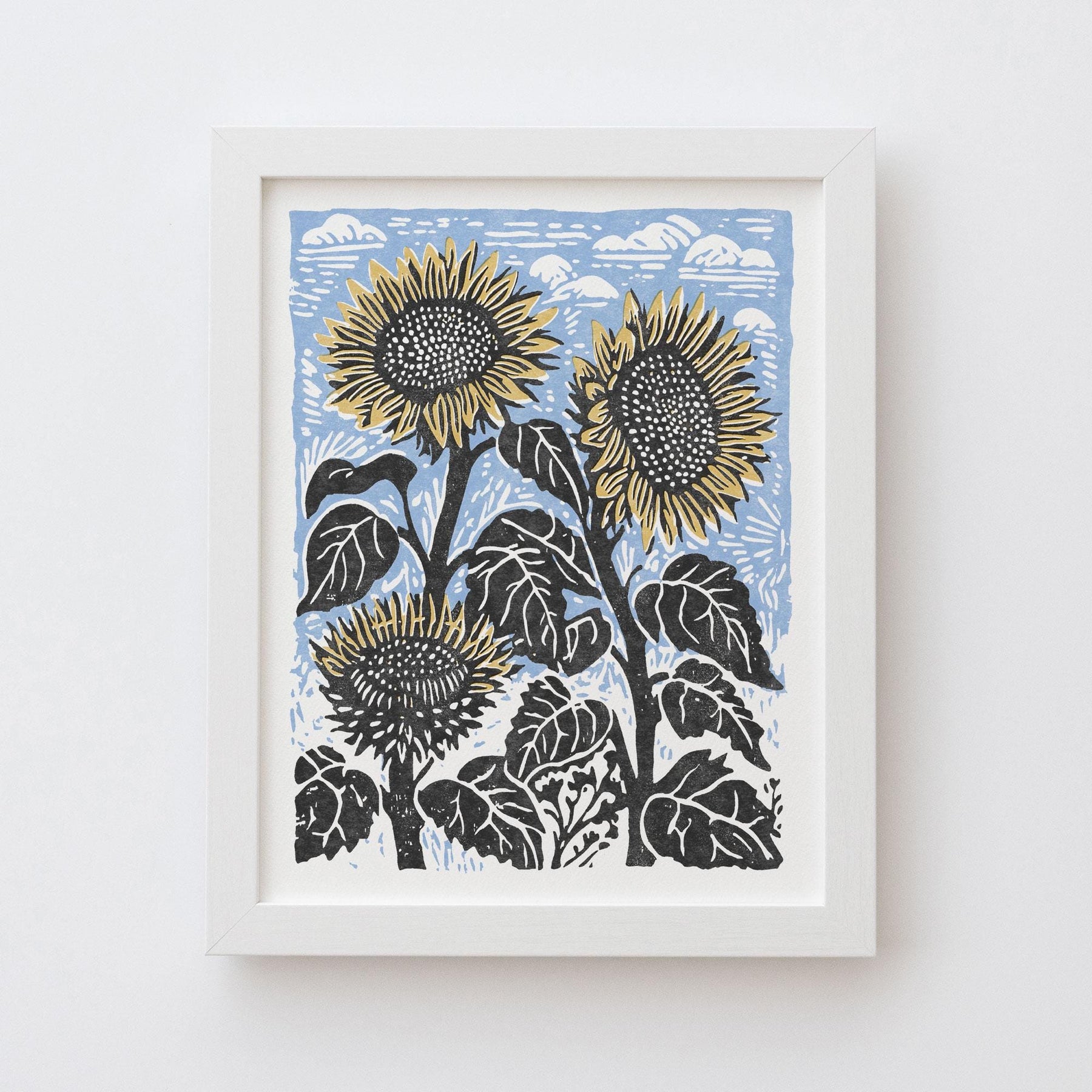 Bright, bold, and full of life—this Sunflowers print captures the joy of late-summer fields in a linocut-inspired style. Each tall stem stretches toward a cloud-dotted sky, their golden petals and leaves carved in rich, textural detail. It’s a cheerful piece that brings instant warmth to any room, radiating the same easy optimism that makes sunflowers so beloved.