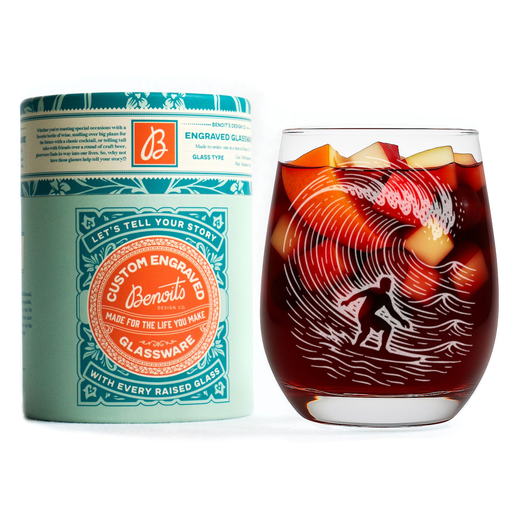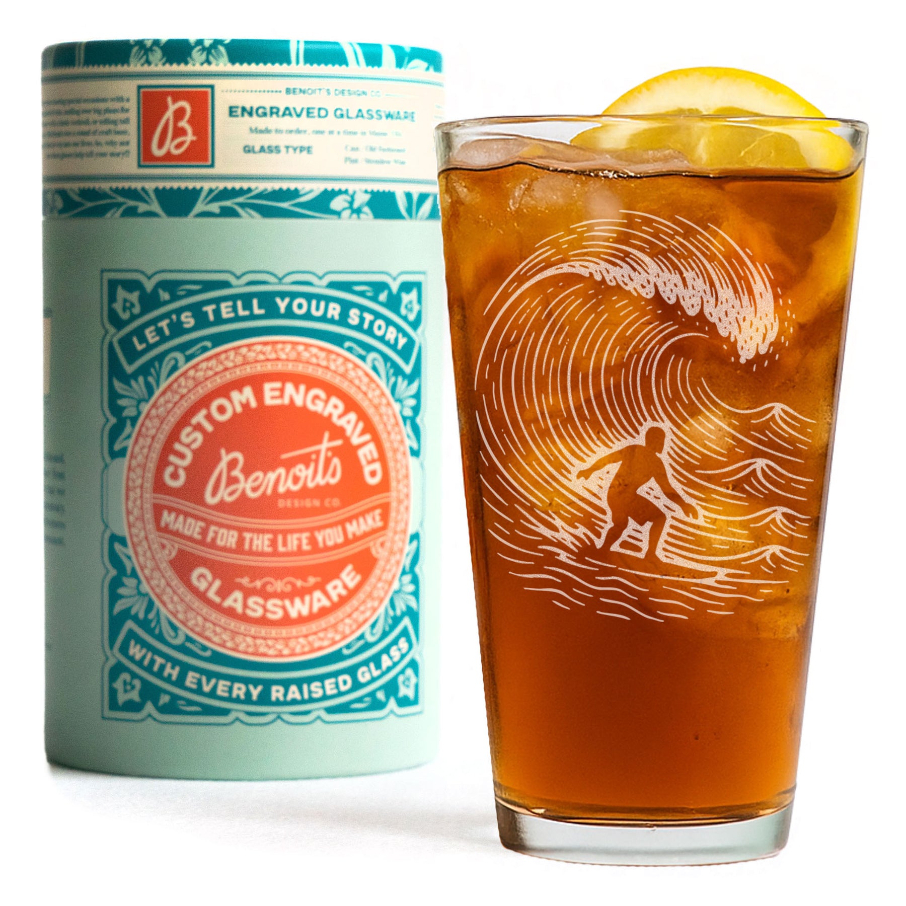 A tribute to perfect waves and the thrill of the ride. This glass features a detailed engraving of a lone surfer carving through a curling wave — a moment of balance, motion, and calm all at once. It’s a timeless design that captures the spirit of surf culture: the early mornings, salt spray, and the endless search for the next perfect break.