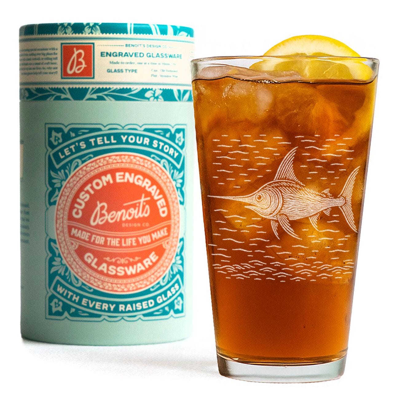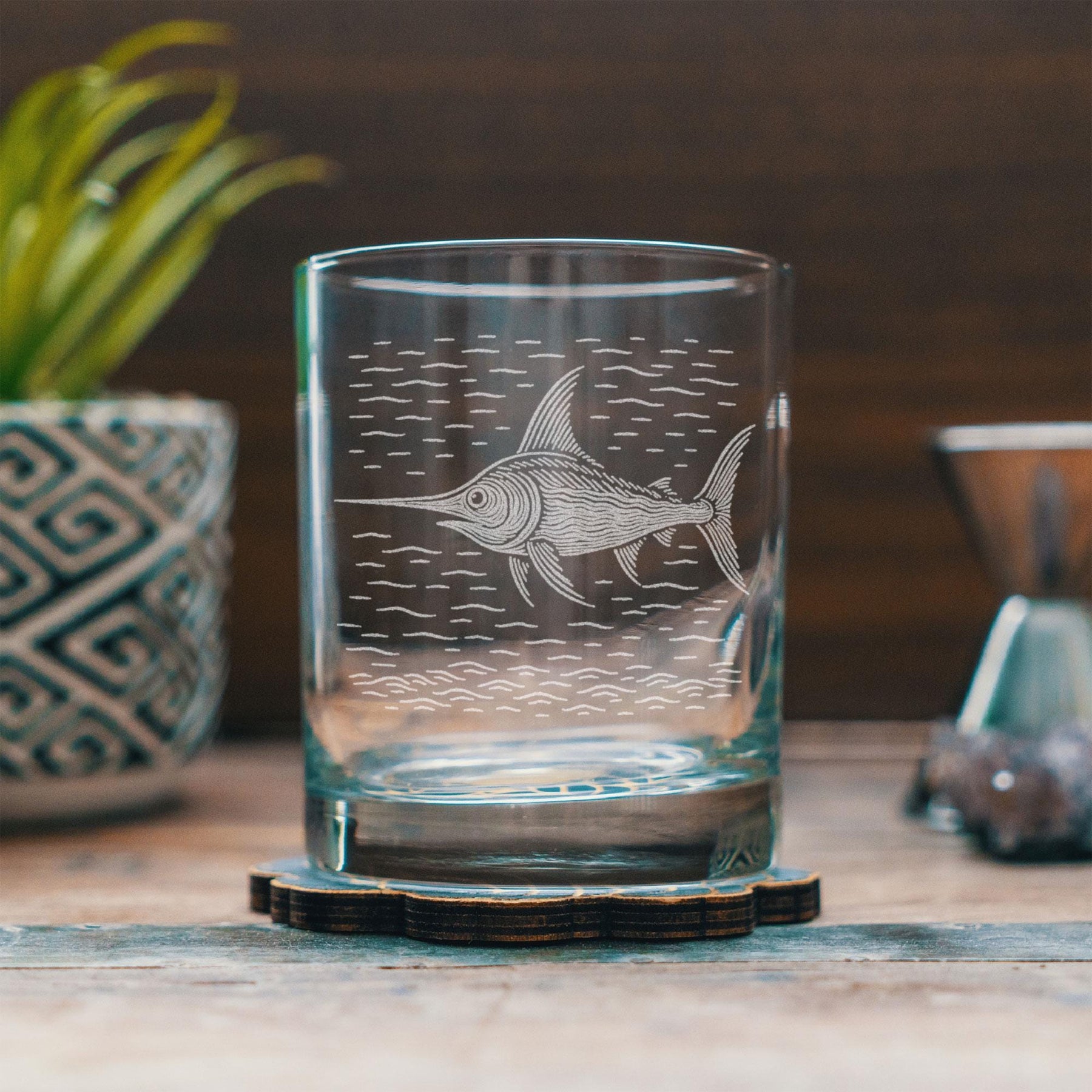 Bring the thrill of the open ocean to every pour with our Swordfish Glass. This finely laser-etched illustration captures the sleek, powerful silhouette of a swordfish cutting through the waves — a perfect homage to the sport, skill, and adventure of deep-sea fishing. Bold lines and crisp detail make this a standout piece for anglers, coastal dwellers, seafood lovers, and anyone who feels at home by the water.
