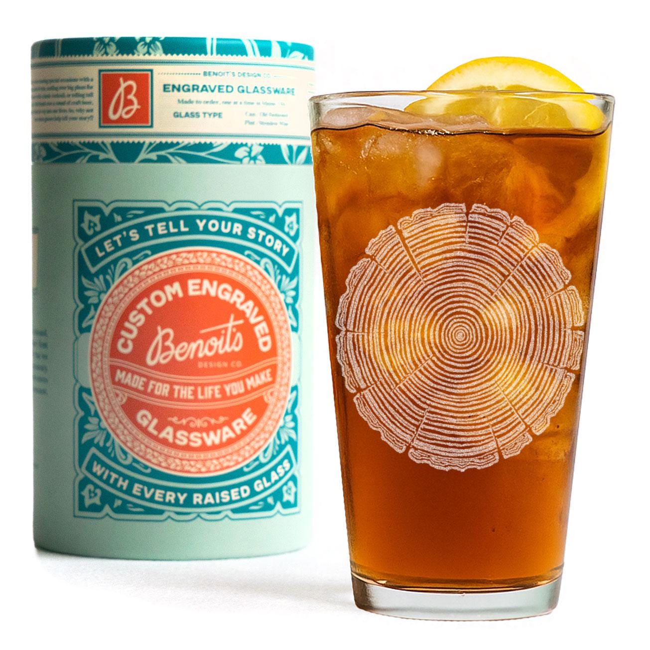 Celebrate the beauty of growth, age, and time with our Tree Rings Glass. This laser-etched illustration captures the intricate rings of a cut tree, each line symbolizing stories lived and seasons passed. Clean white linework creates a striking woodcut effect — perfect for hikers, campers, nature lovers, and anyone who appreciates the quiet wisdom of the forest.
